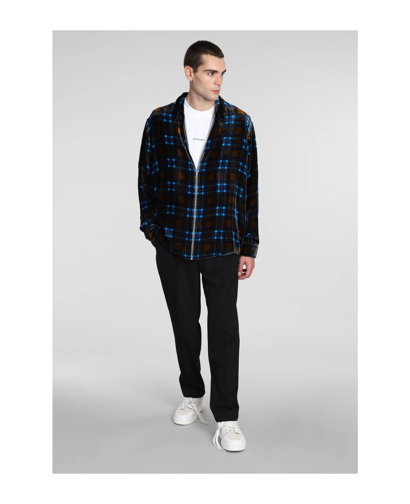Shirt in blue viscose, collar, check print, long sleeves, Made in China, 82% viscose, 82% nylon 18% spandex, Model is 183 cm and wears 48