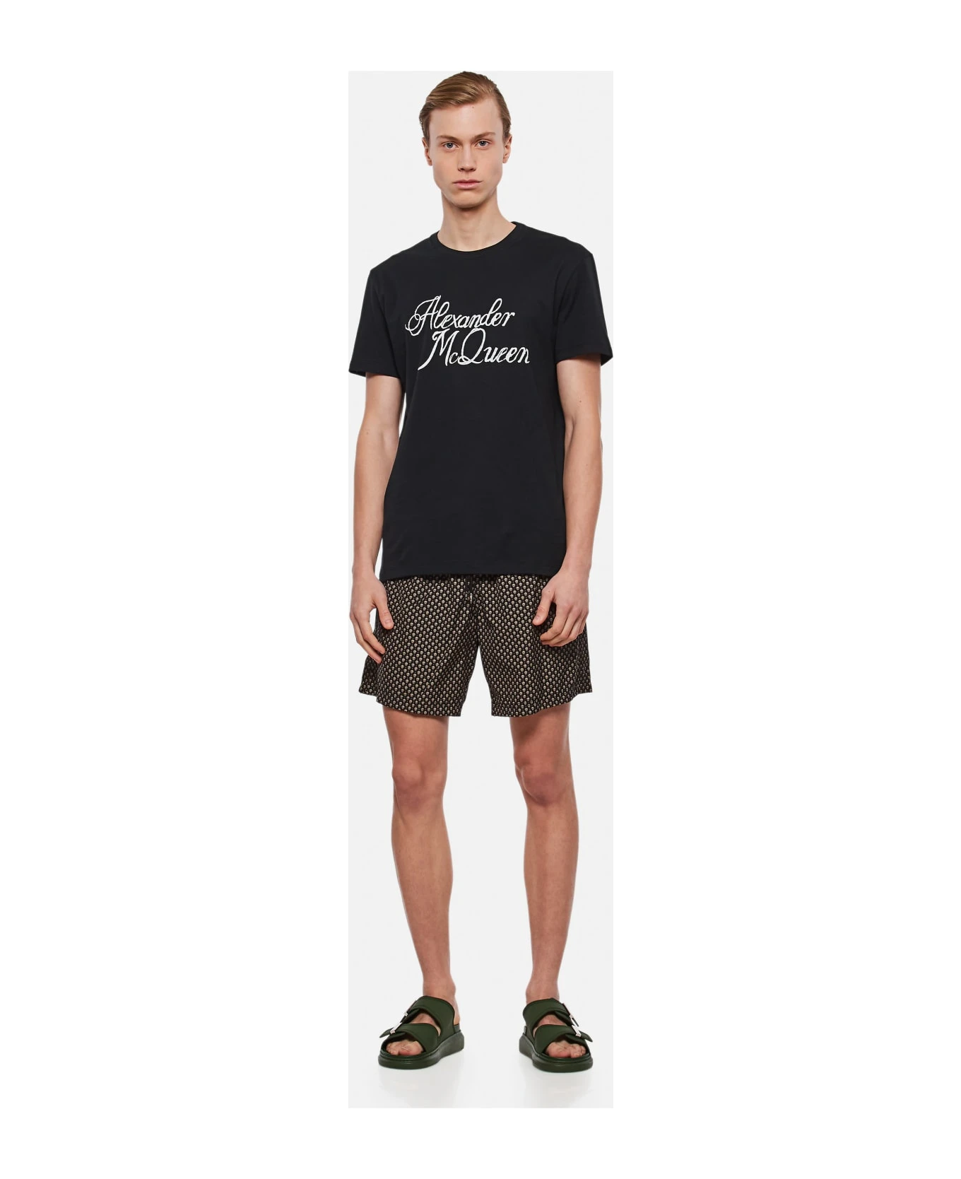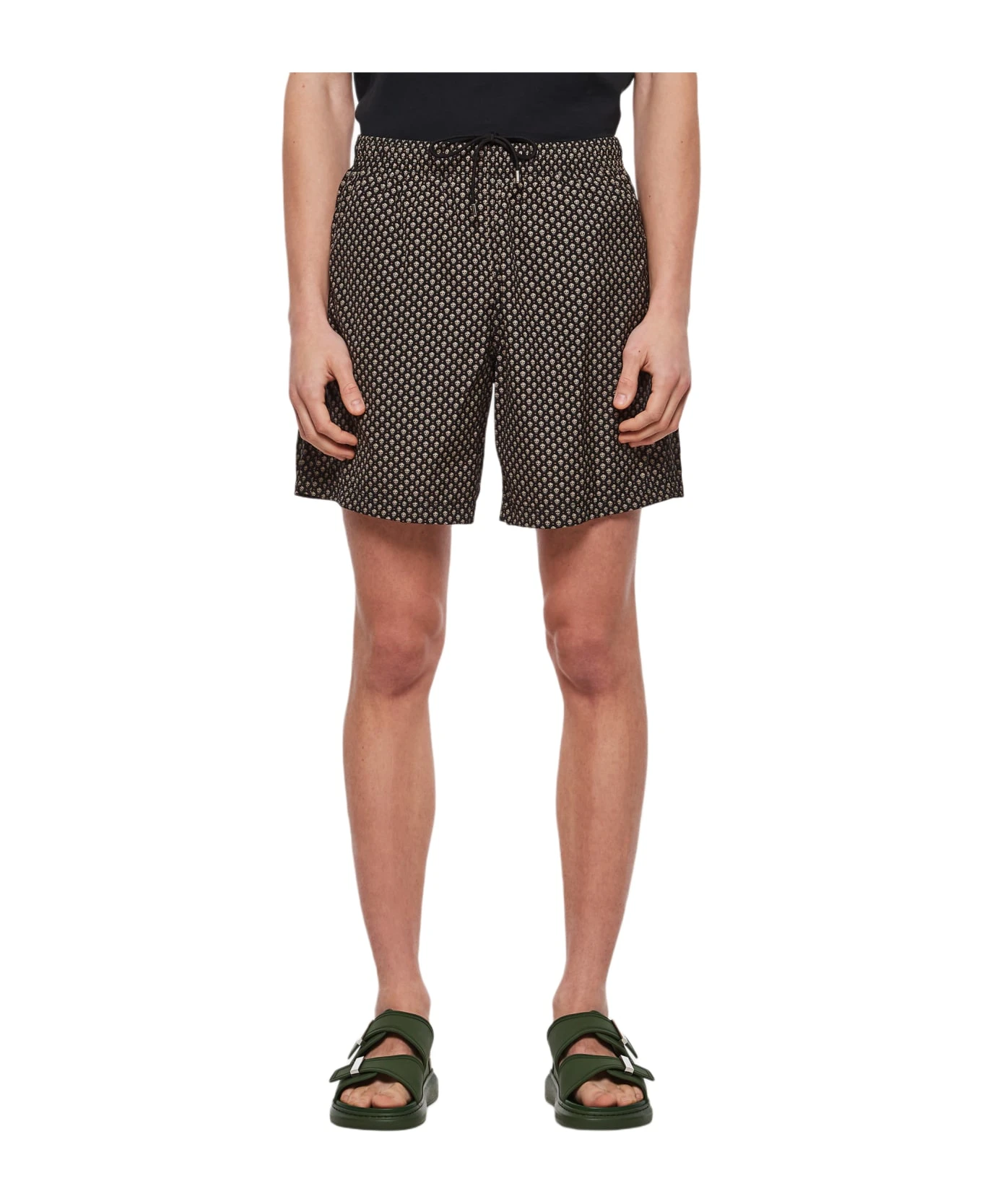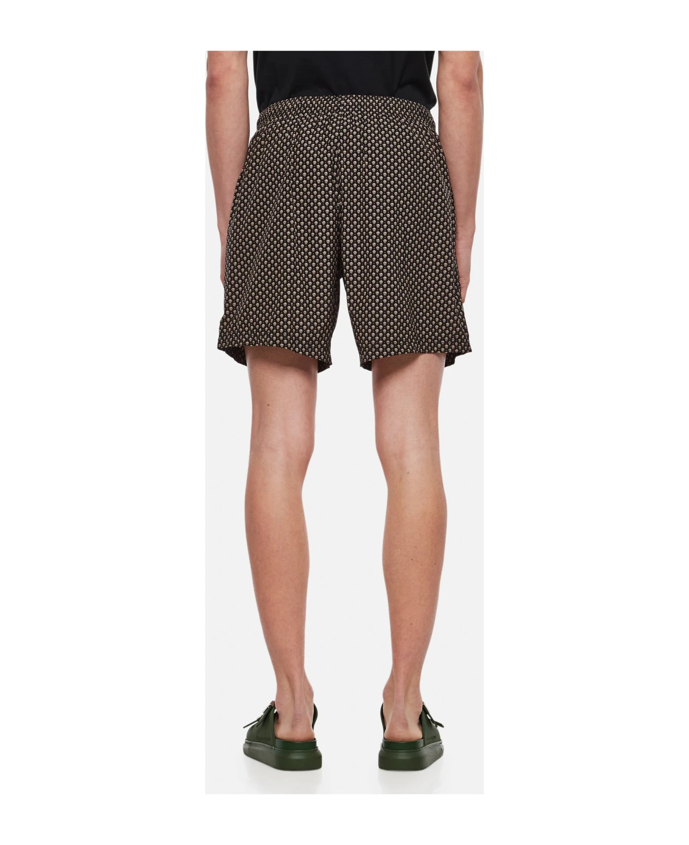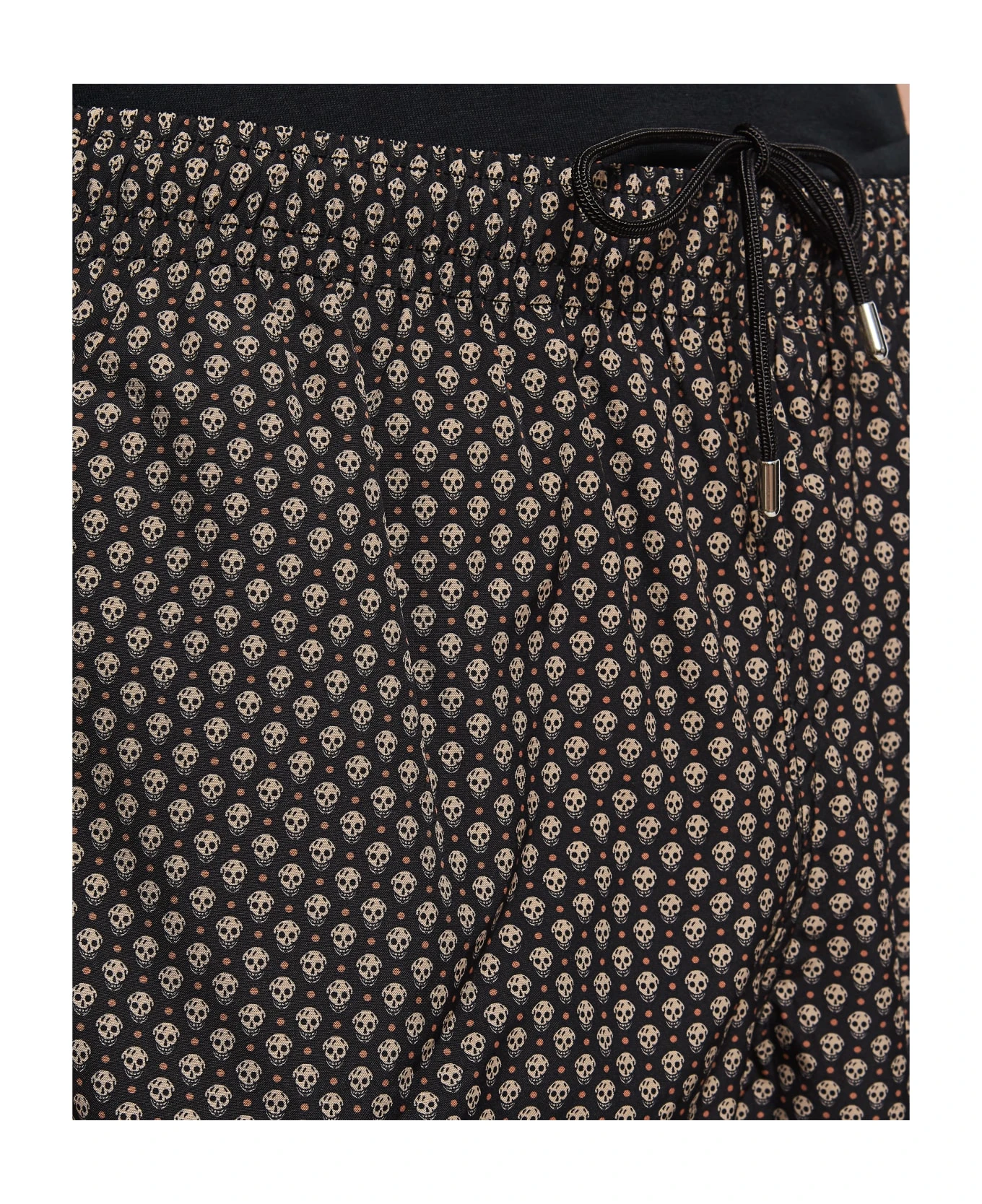 Elastic waistband. Mesh lining. All over print placement may vary. Two side pockets. Colour: black.