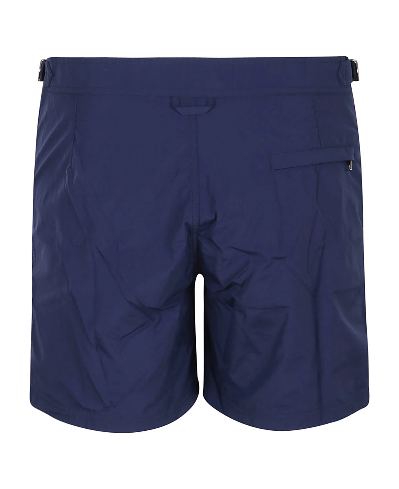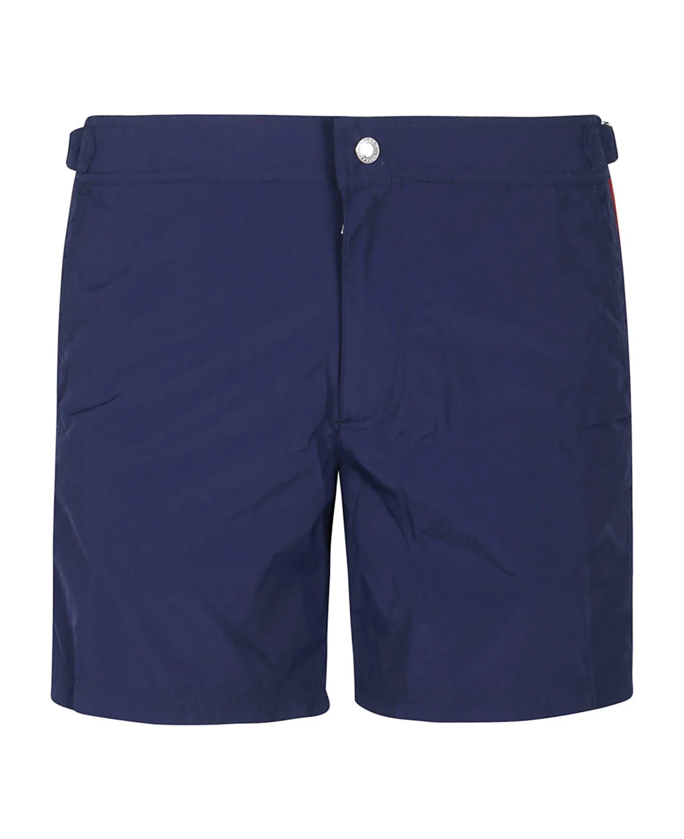 Navy color swimsuit BY ALEXANDER MCQUEEN. Front closure with hidden zip and visible button; welt pocket on the back and two side. Featuring a contrasting side logo band.