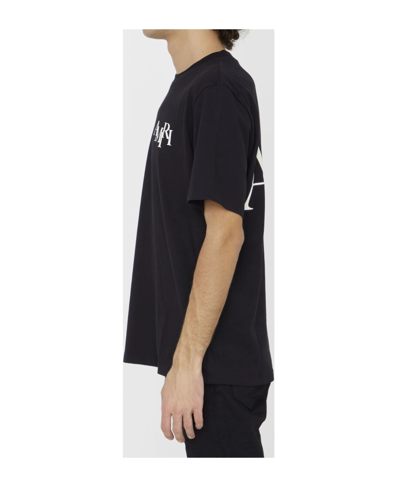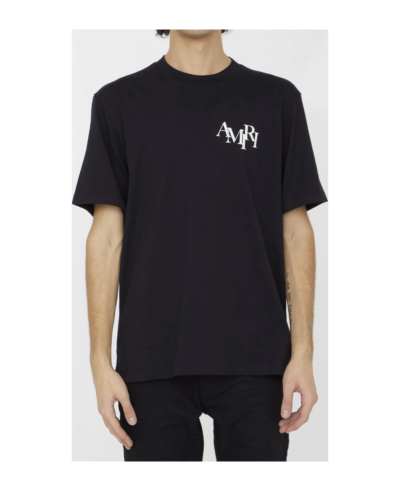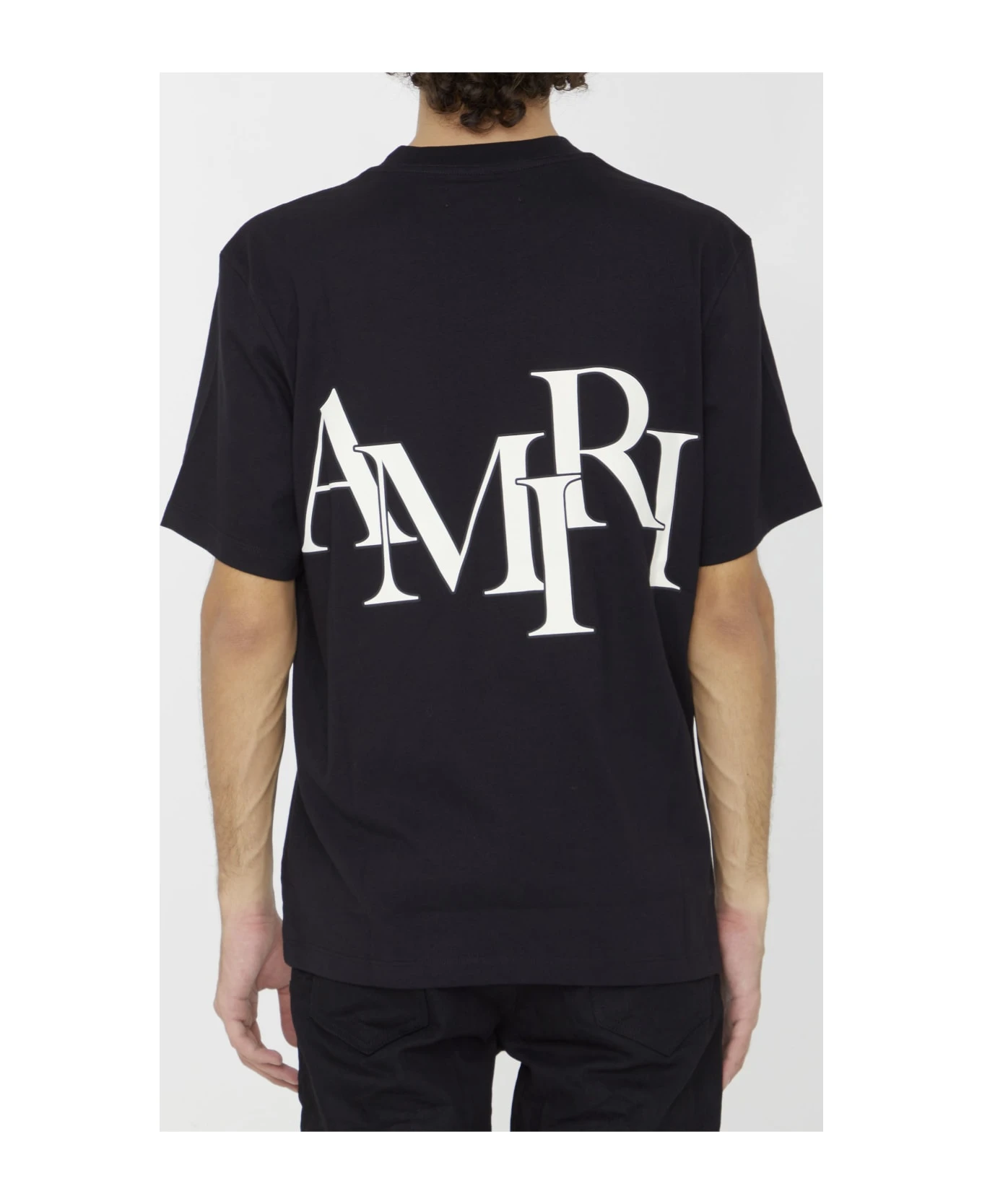 Short-sleeved crewneck t-shirt in black cotton with Amiri Staggered logo printed on chest and on the back. Ribbed neck. Regular fit.