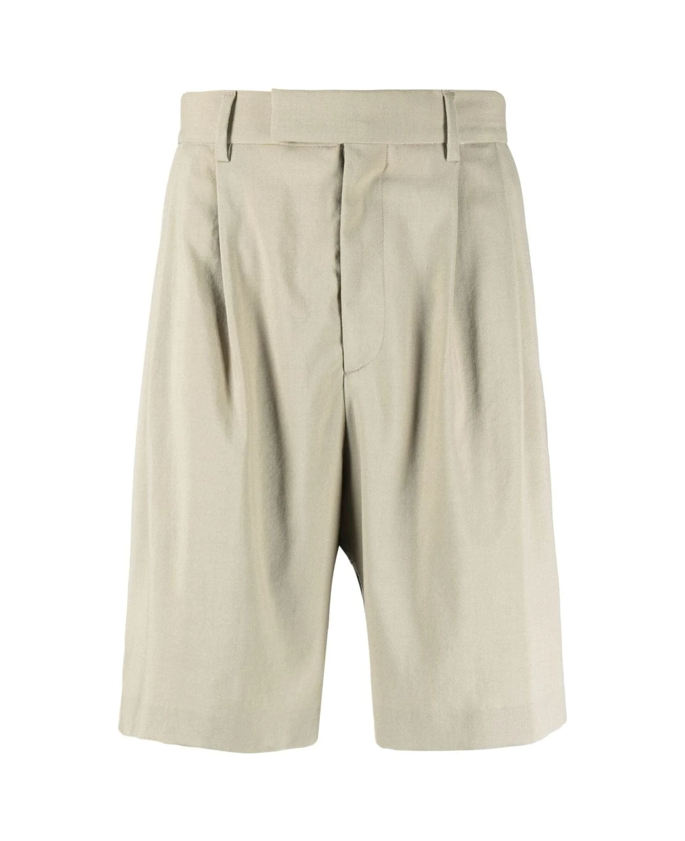 Amiri shorts made from a tan-coloured wool blend and featuring a medium waist, belt loops, a covered front fastening, a front and back ironed pleat, two side slit pockets and two welt pockets on the back, one of which has a button.