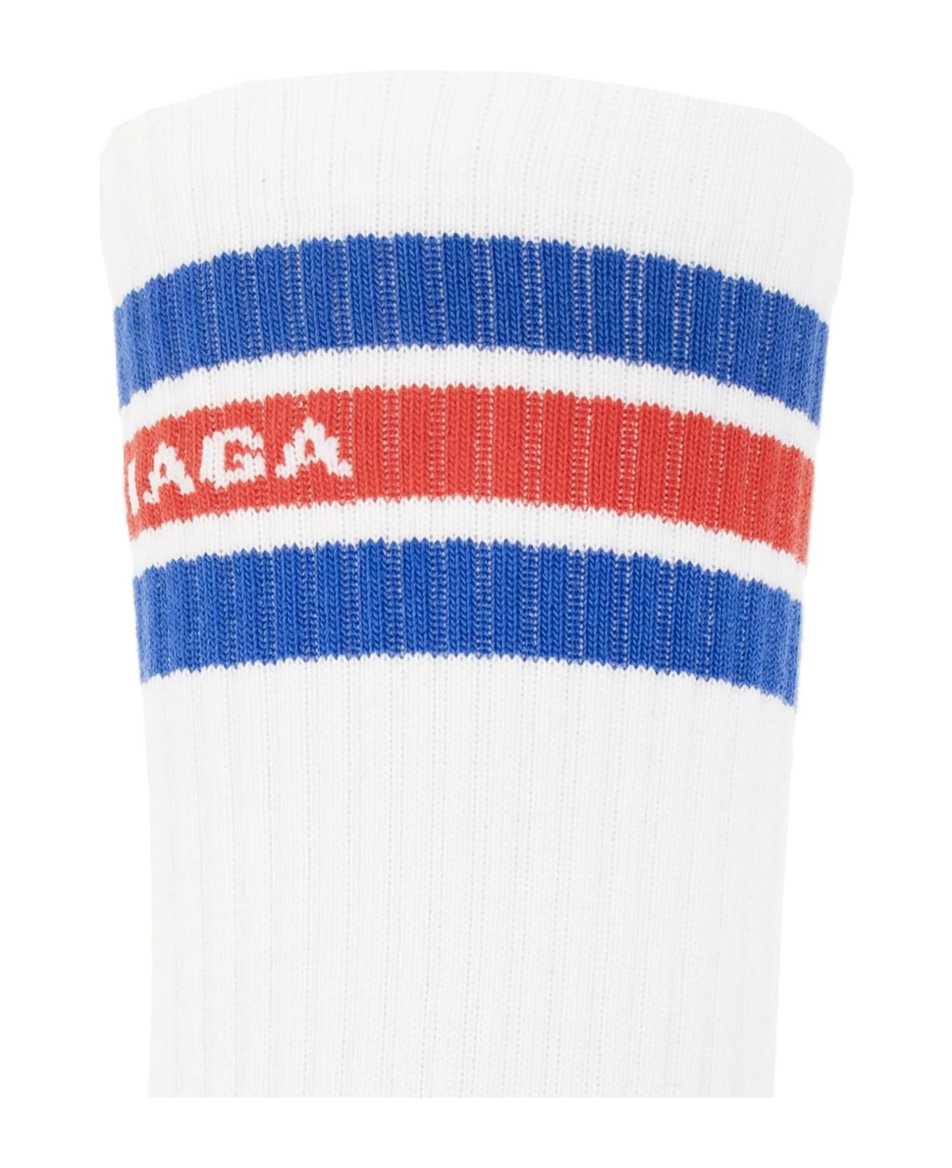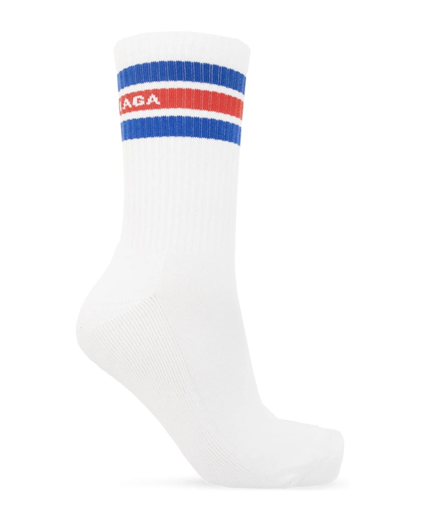 White socks from Balenciaga. Made of cotton, this pair features a blue and red stripe pattern, logo and ribbed cuffs.