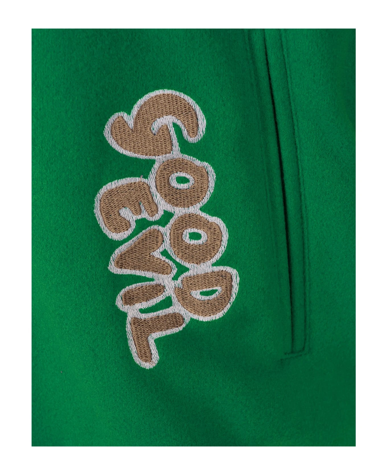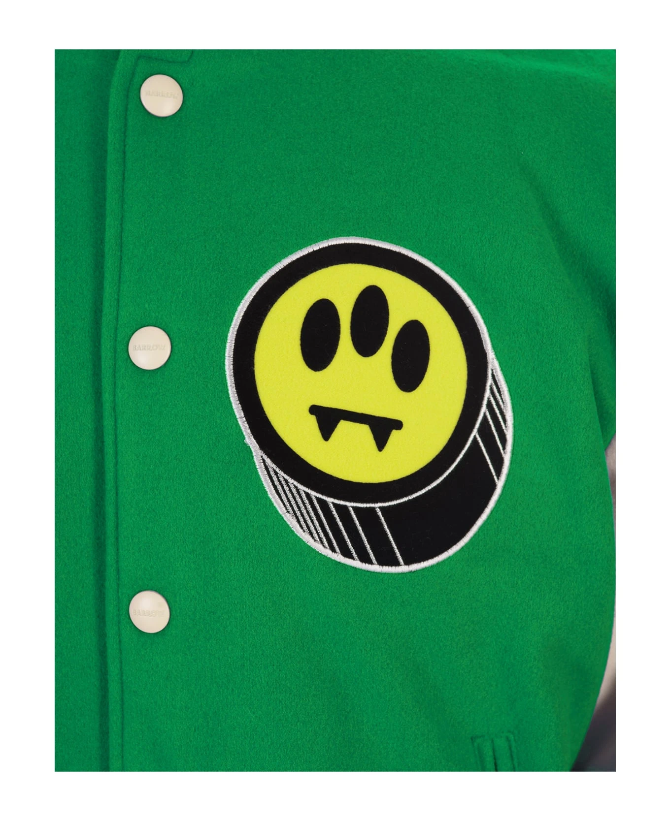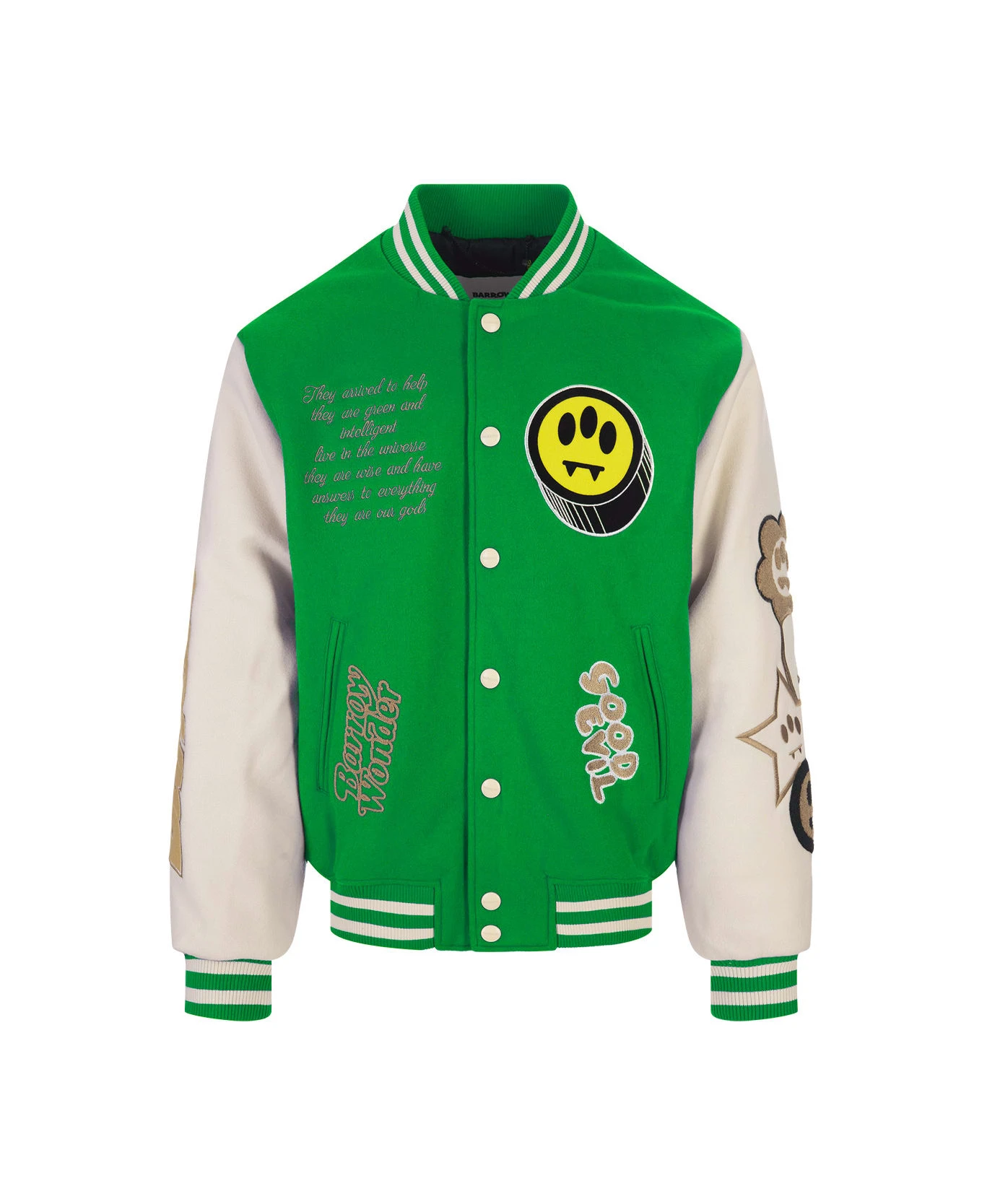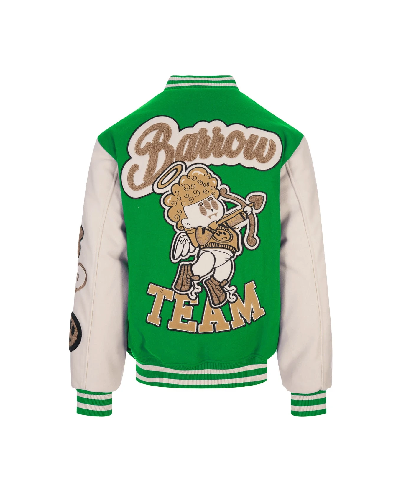 College bomber jacket by Barrow made of green cloth with contrasting sleeves, striped knit finishes, button closure and all-over embroidered patches.