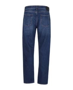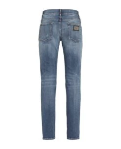 Jeans realized in pure stonewashed and distressed cotton denim with logoed printed silk inserts at the front and the back enriched by logoed metal plate at the back.