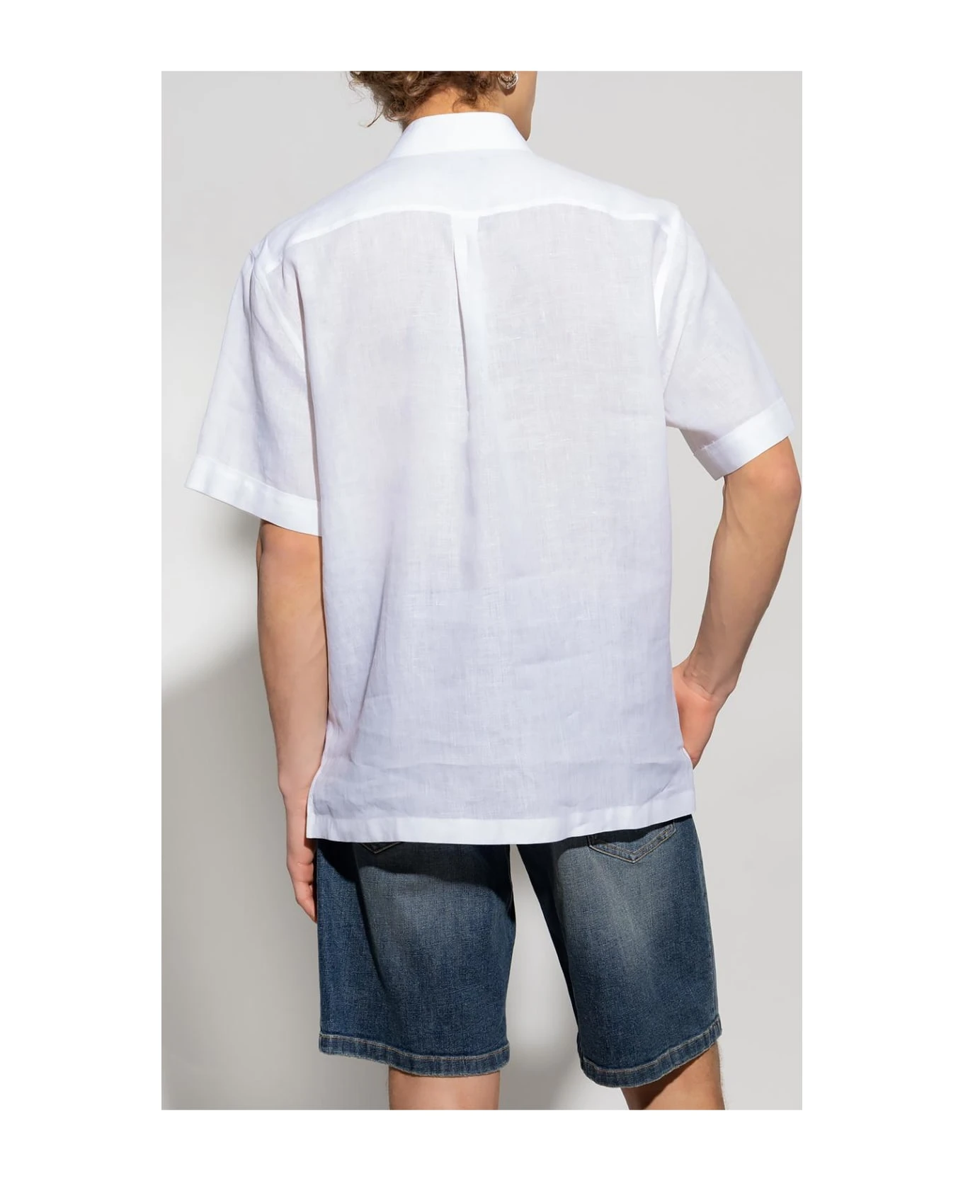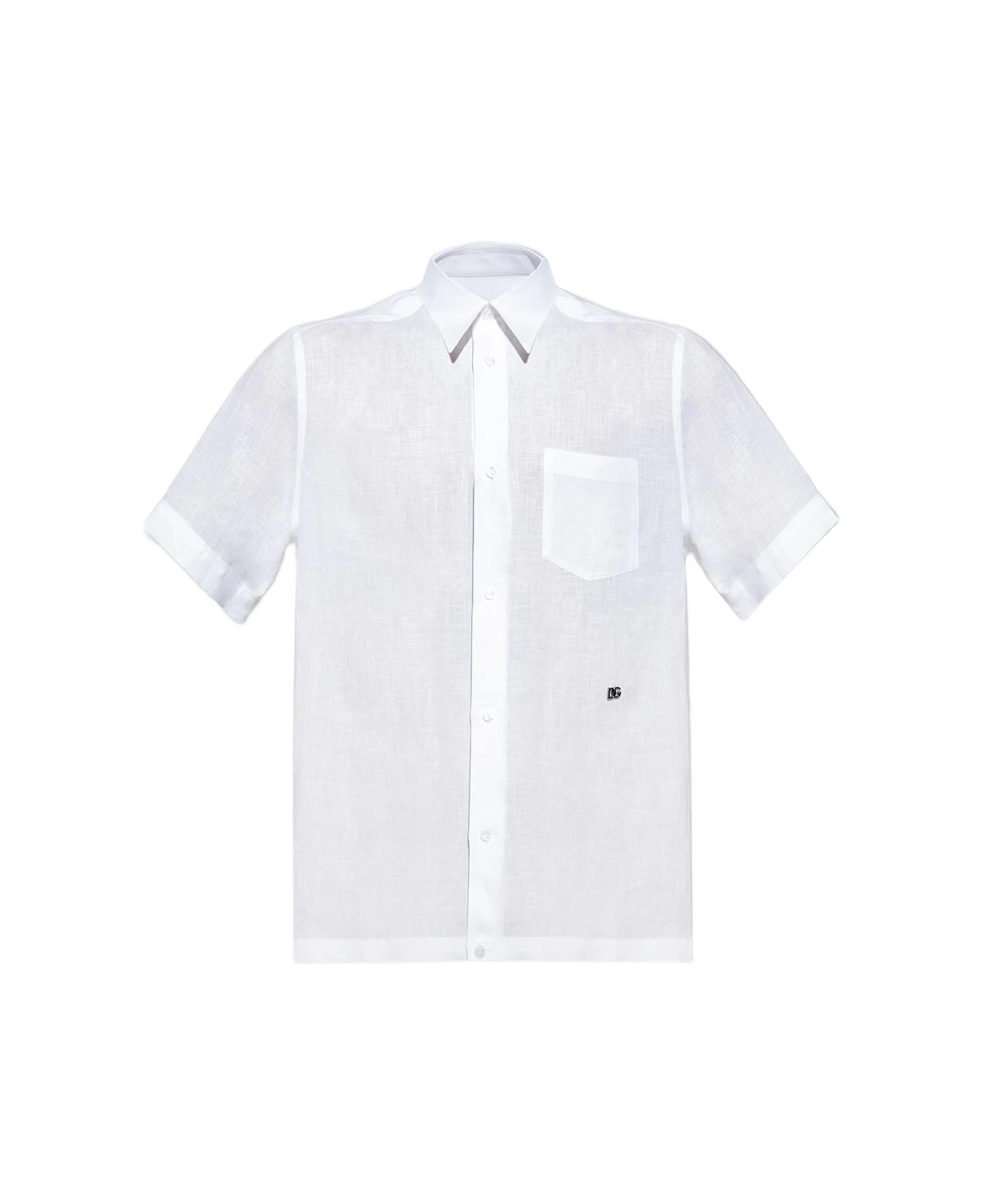 White shirt from Dolce & Gabbana. Crafted from linen, this style fastens with buttons and features side slits and a slip chest pocket accompanied with a grey logo appliqué.