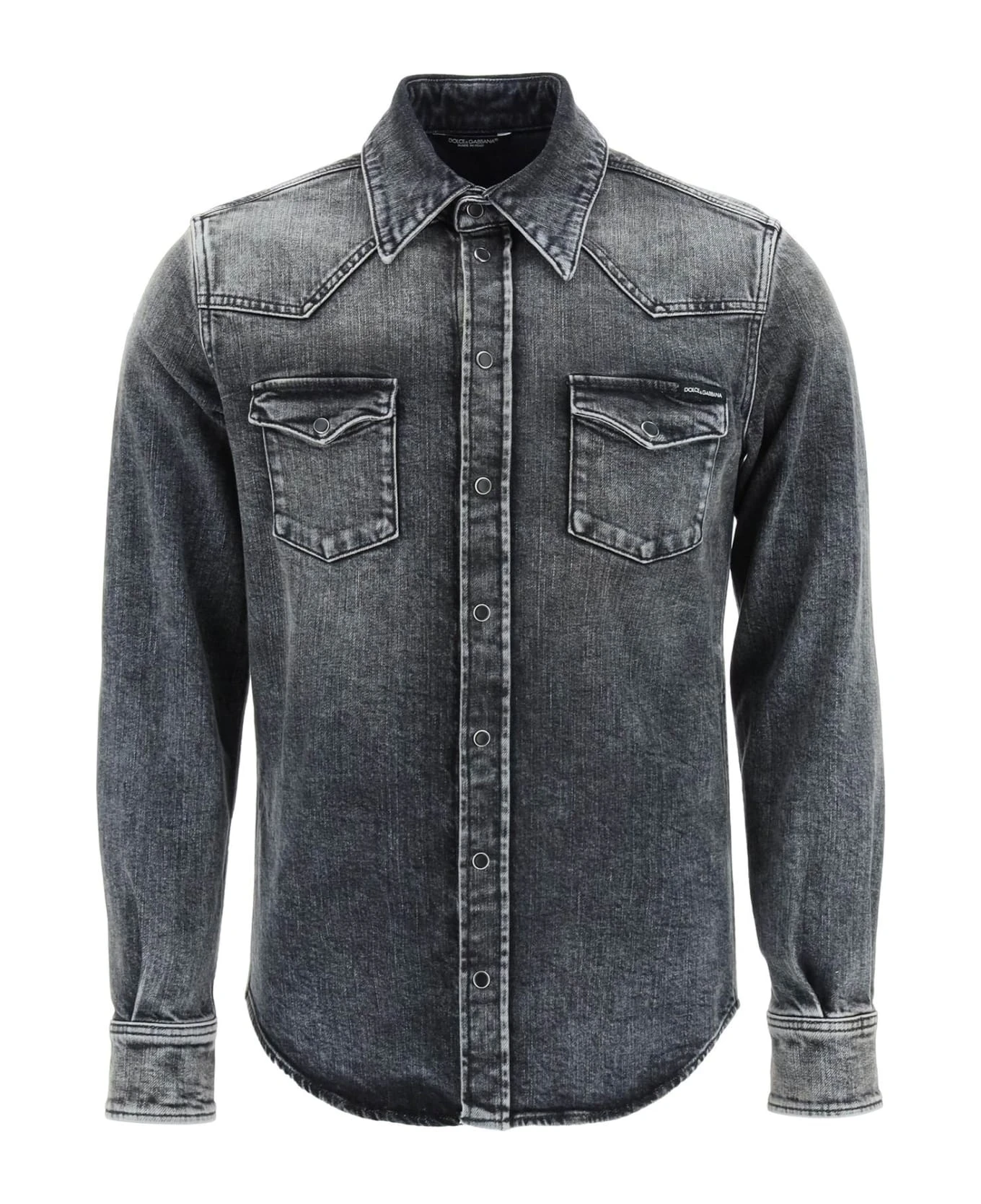 Stretch denim shirt by Dolce & Gabbana designed with western-style yokes and two chest pockets. Cut to a slim fit, it features a snap fastening, adjustable two-button cuffs, and a metal logo plate on the back. The model is 187 cm tall and wears a size 40.
