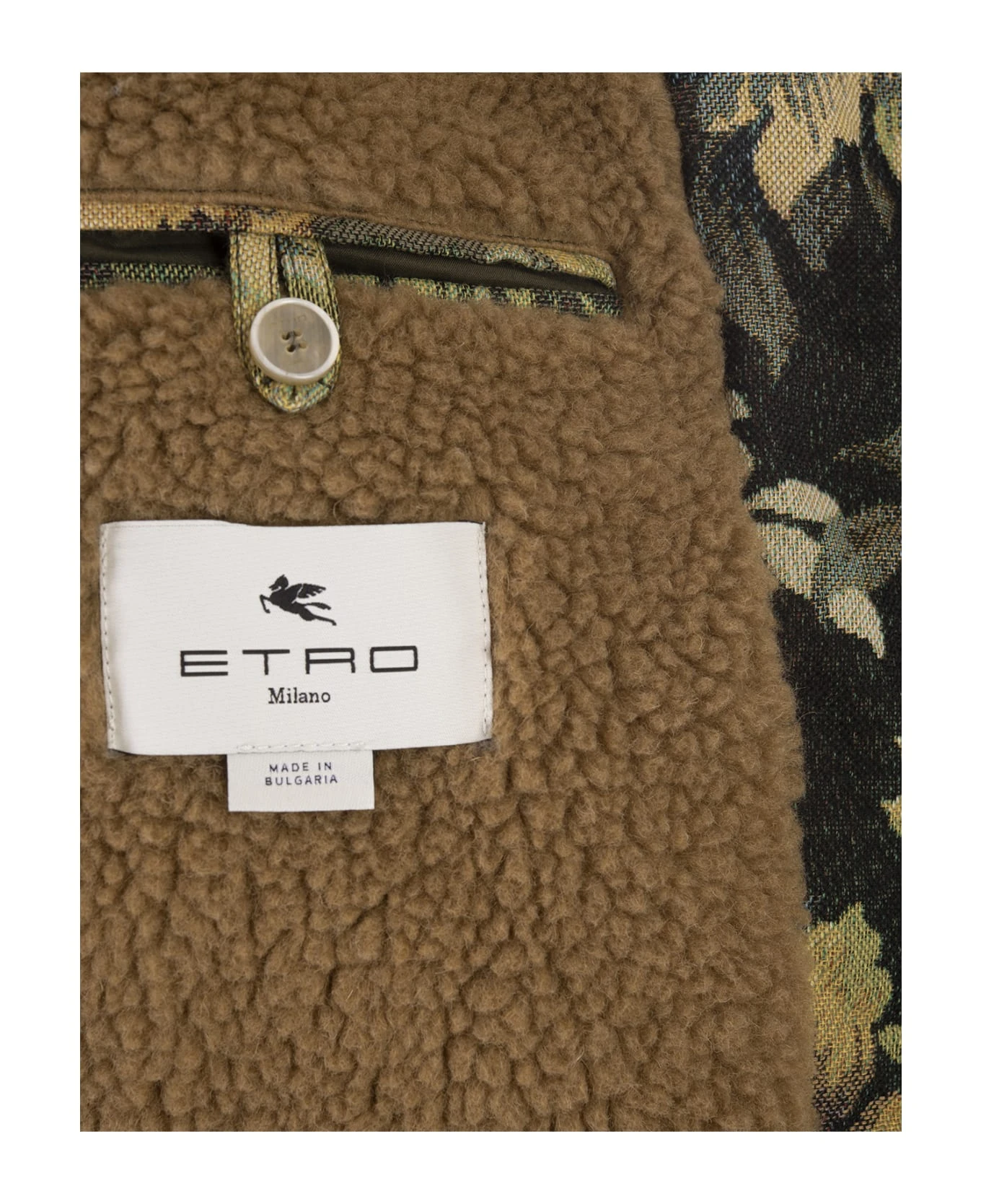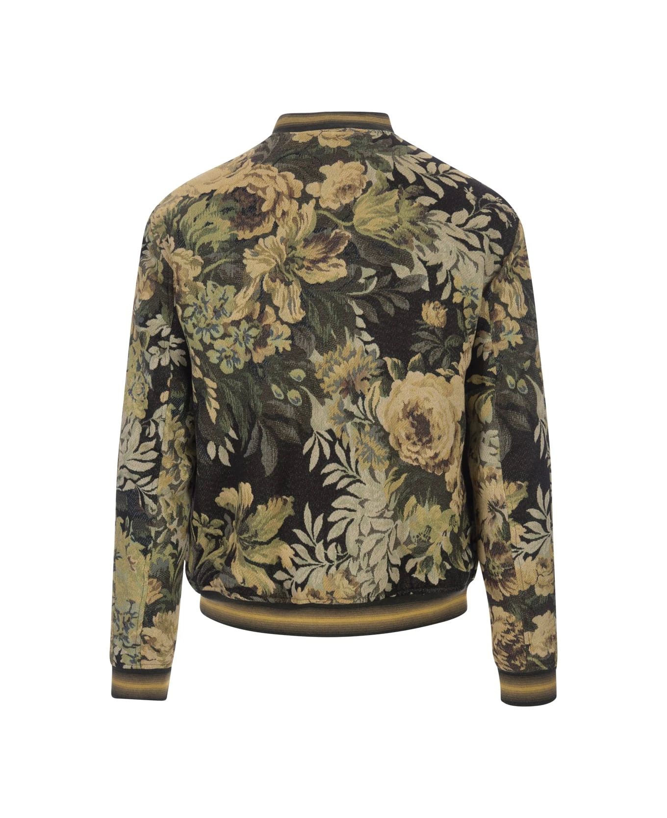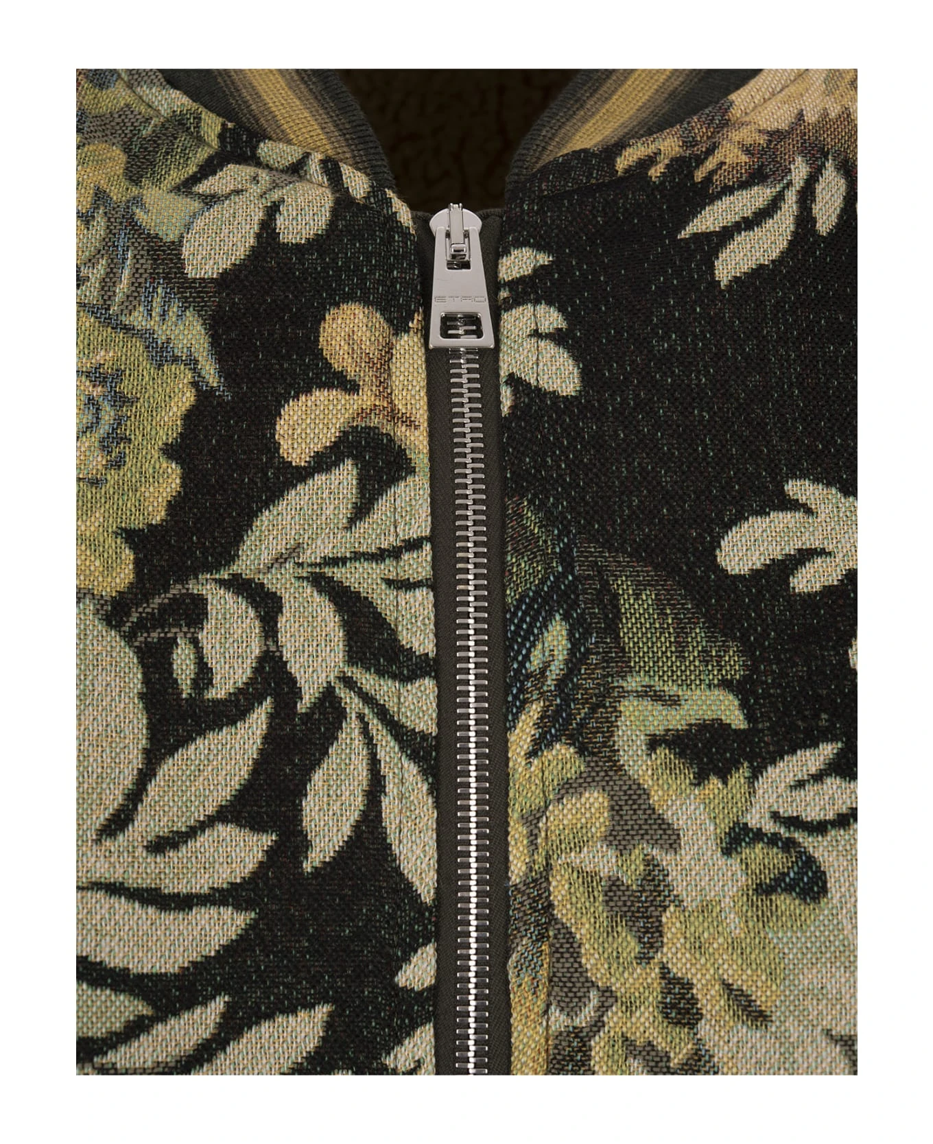 Etro bomber jacket for men made of green cotton blend with all-over flower print. The garment features long sleeves, an embroidered Etro with Pegasus logo on the chest, a double-slider front zip fastening and ribbed knit edges with a striped pattern.