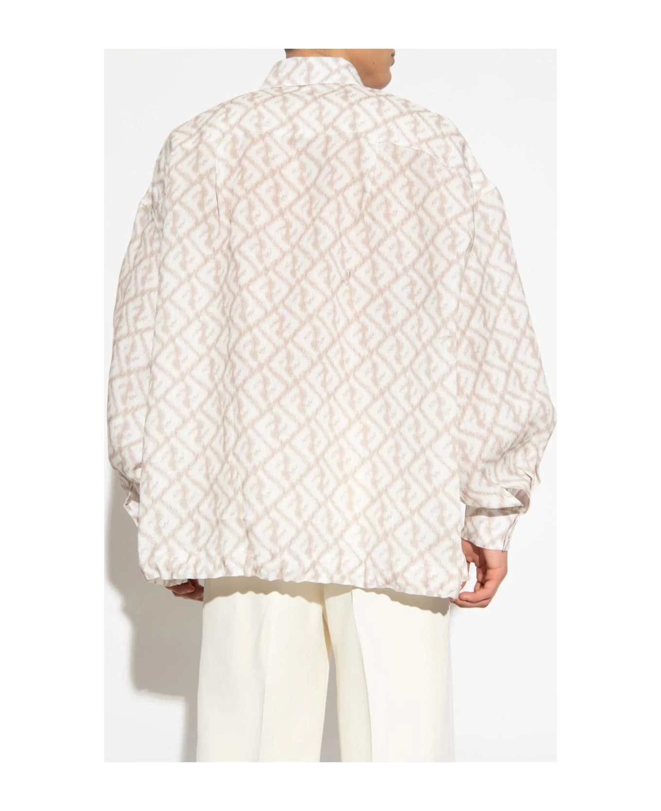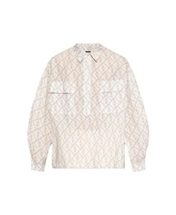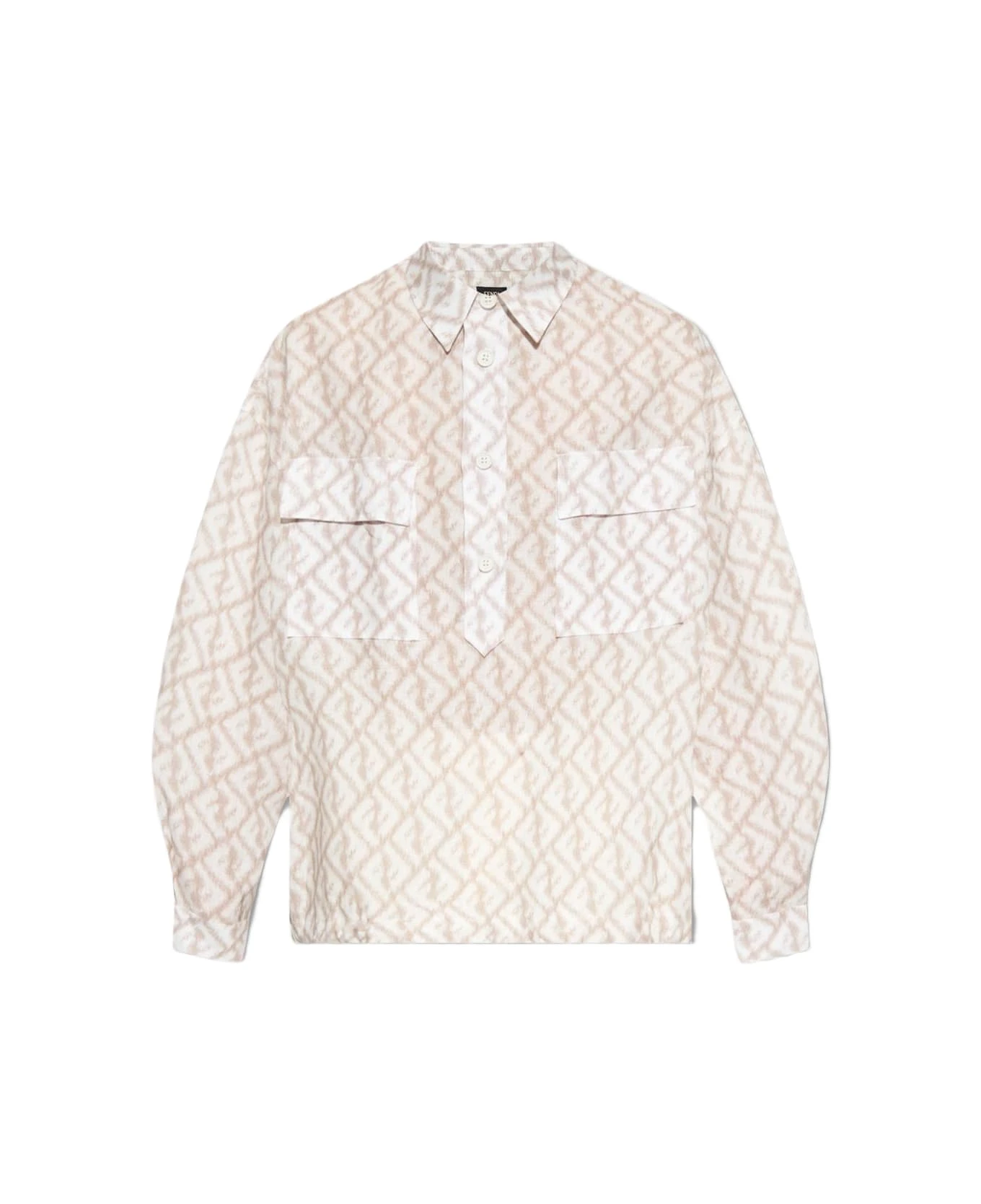 White and beige loose-fitting shirt from Fendi. Made of linen, this design features a buttoned collar, monogram detail, two flap pockets, drawstring hem and long sleeves with buttoned cuffs.