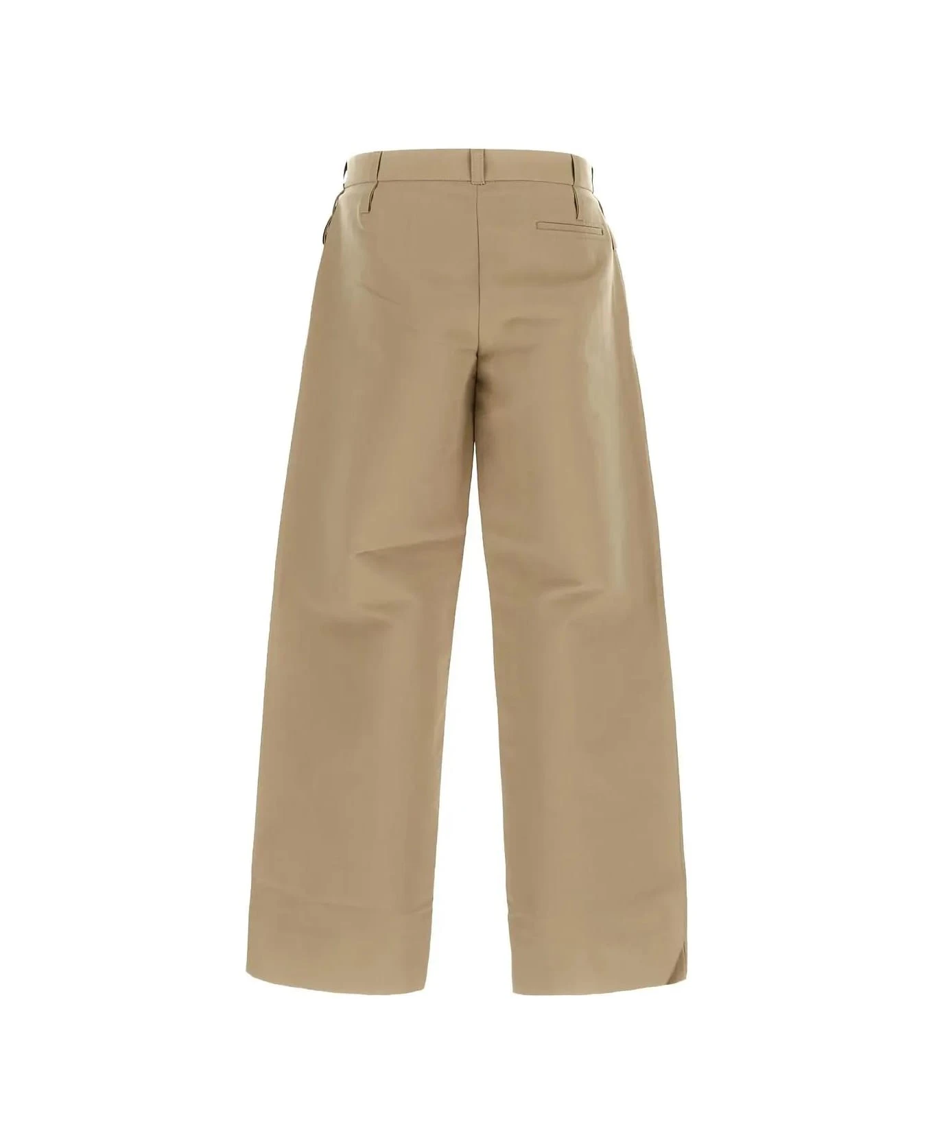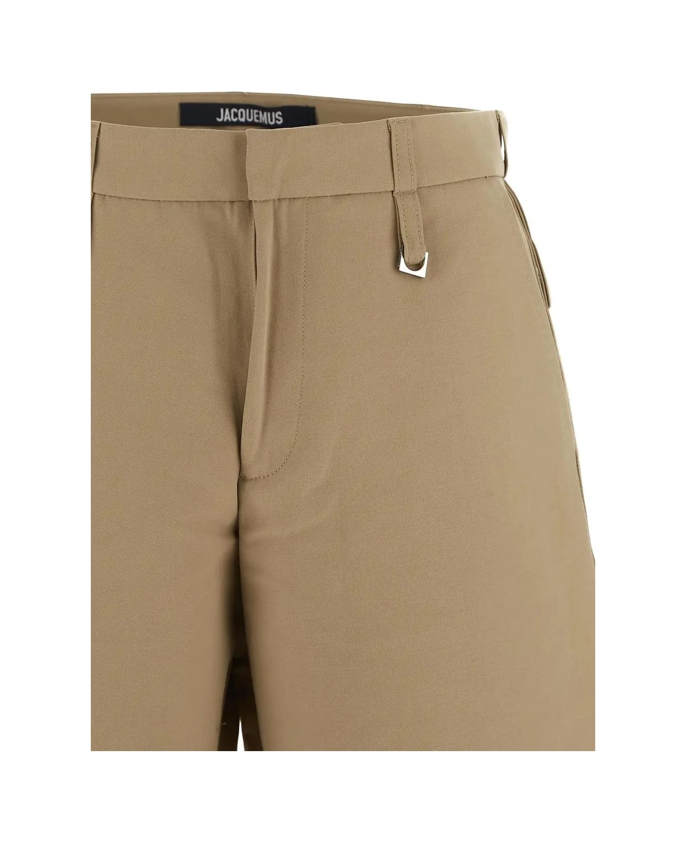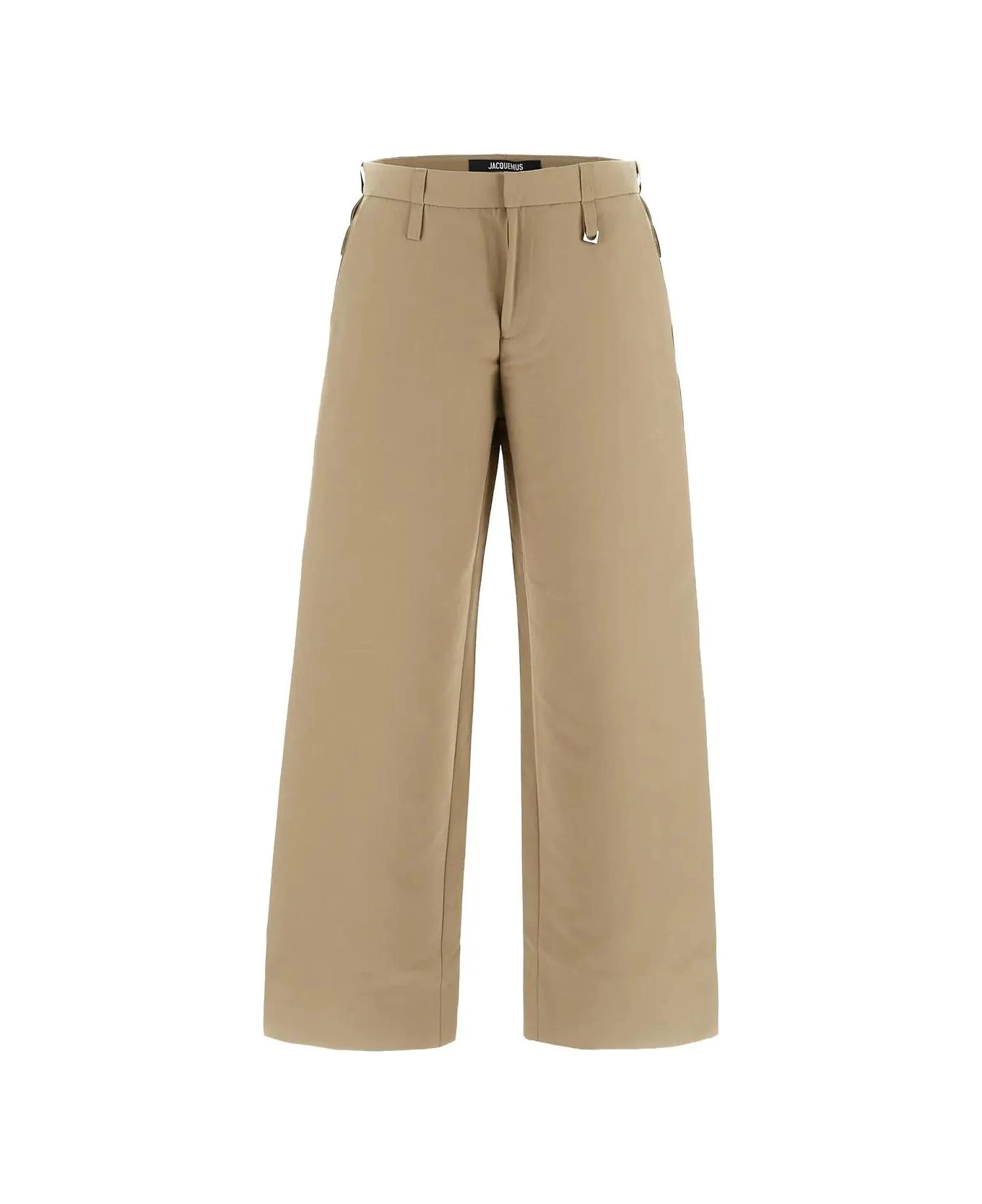 Jacquemus tailored pants in beige soft beige cotton and polyamide with mid-rise, loose fit, hidden zip and button closure, double belt loops, silver-finish metal D-ring on the front belt loop, slanted pockets, two front pockets, a back pocket and contrast stitching.
