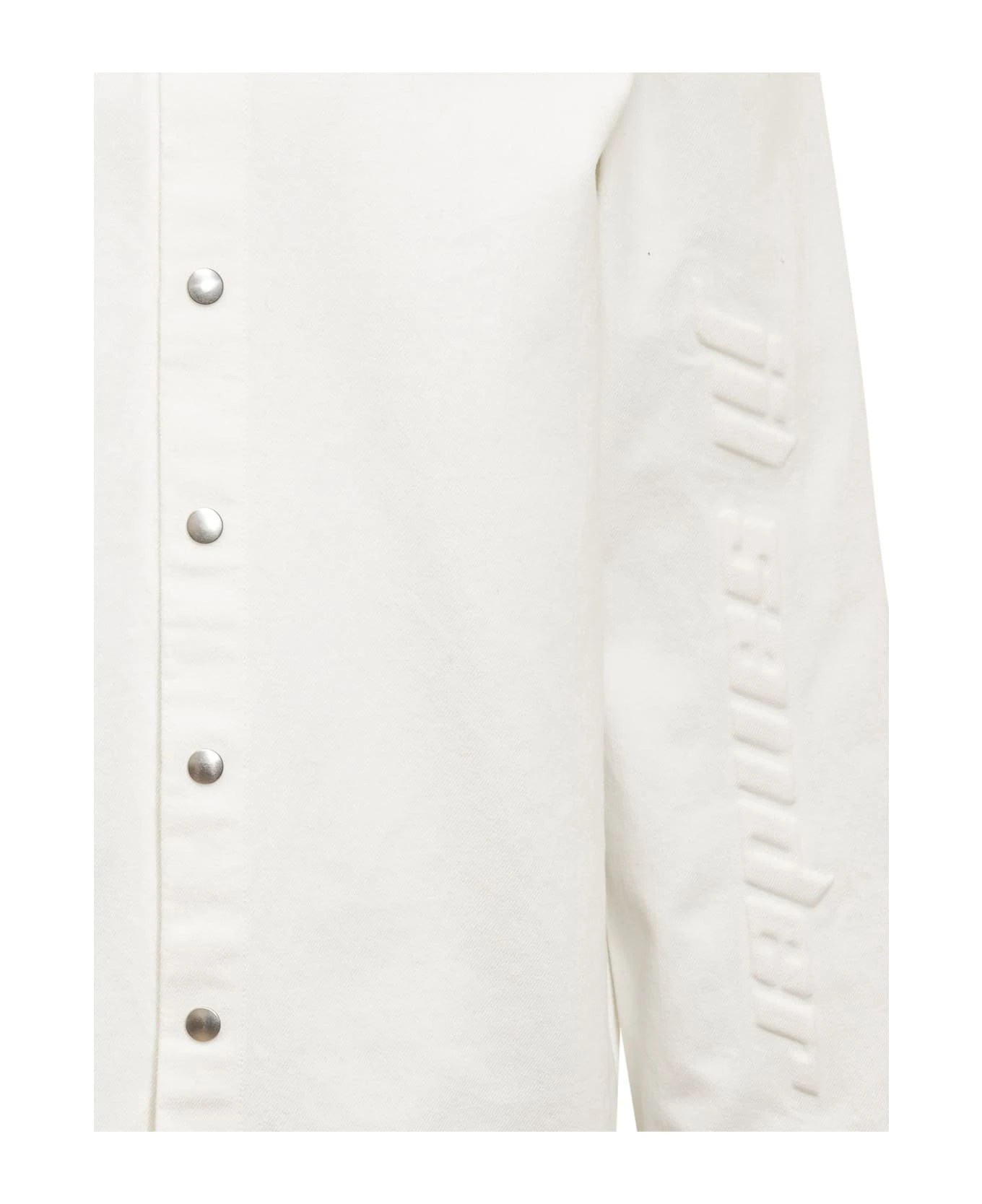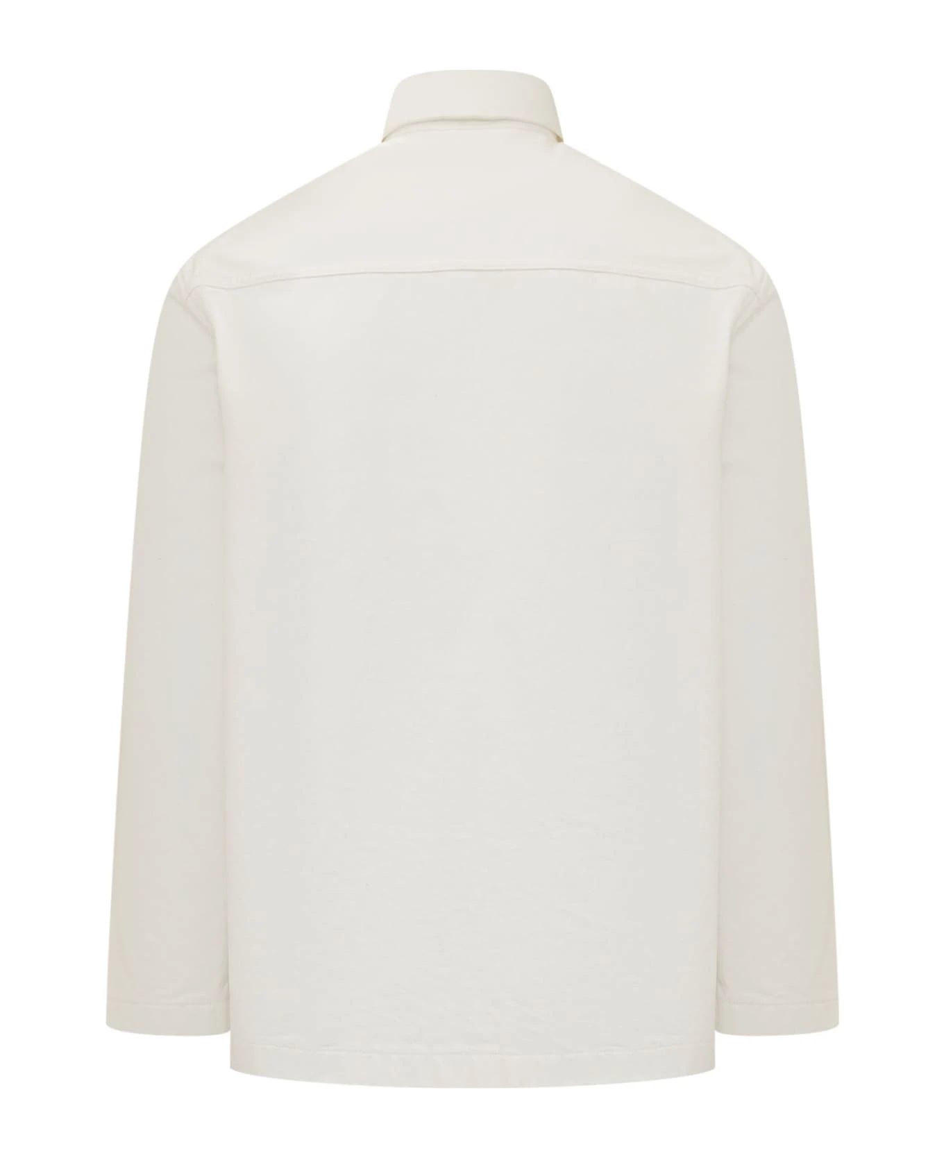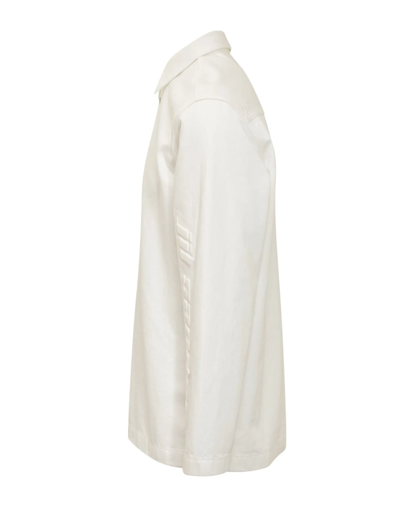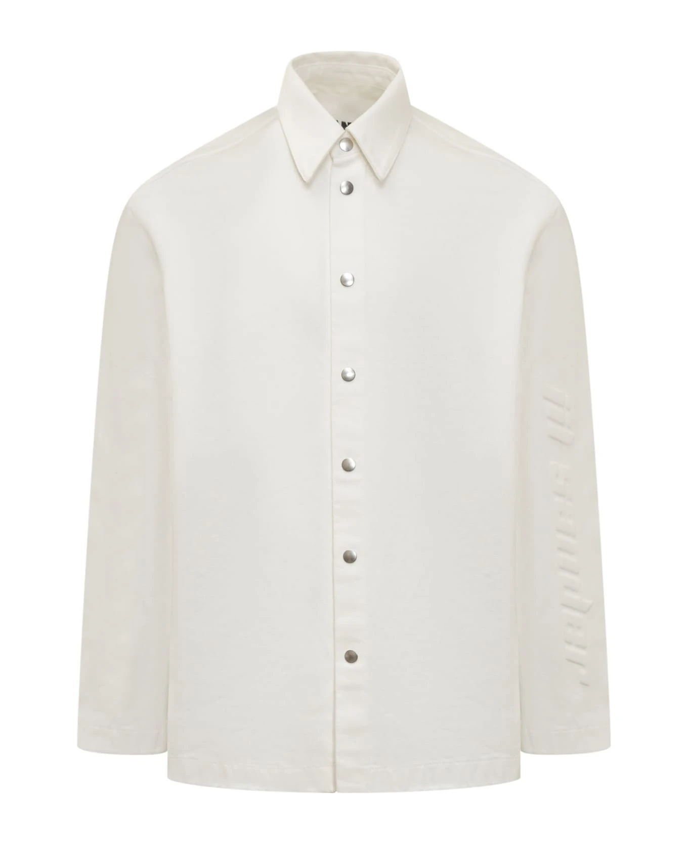 White shirt with long sleeves. Front button closure. Logo on the sleeve.