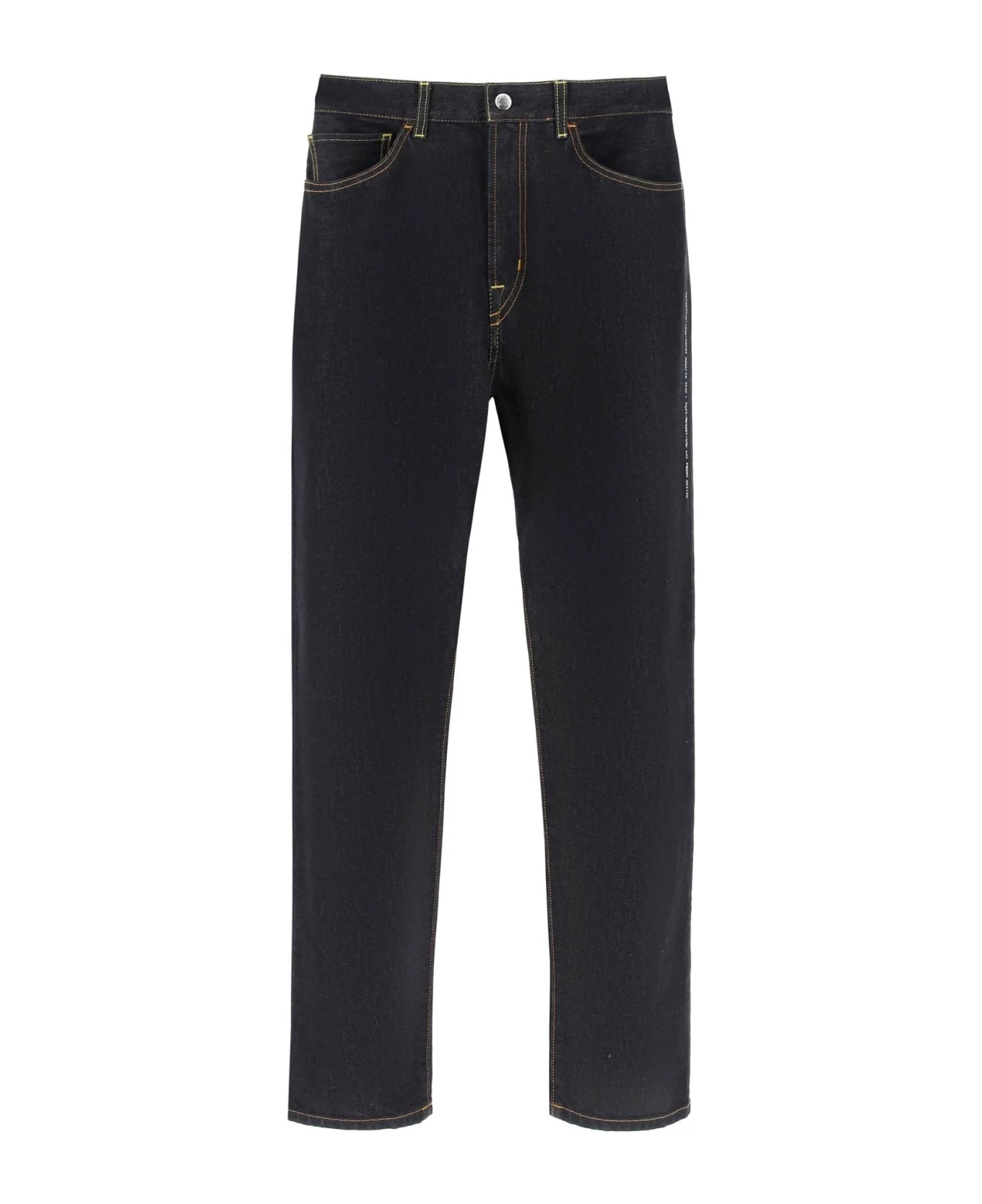 Five-pocket jeans from Moncler x FRGMT, part of the Moncler Genius project, made of used-effect denim with contrast stitching throughout and printed lettering on the left side. Cut to a relaxed fit with mid-rise waist, this style is fastened with a zip fly and a monogram button. The model is 187 cm tall and wears a size IT 48.