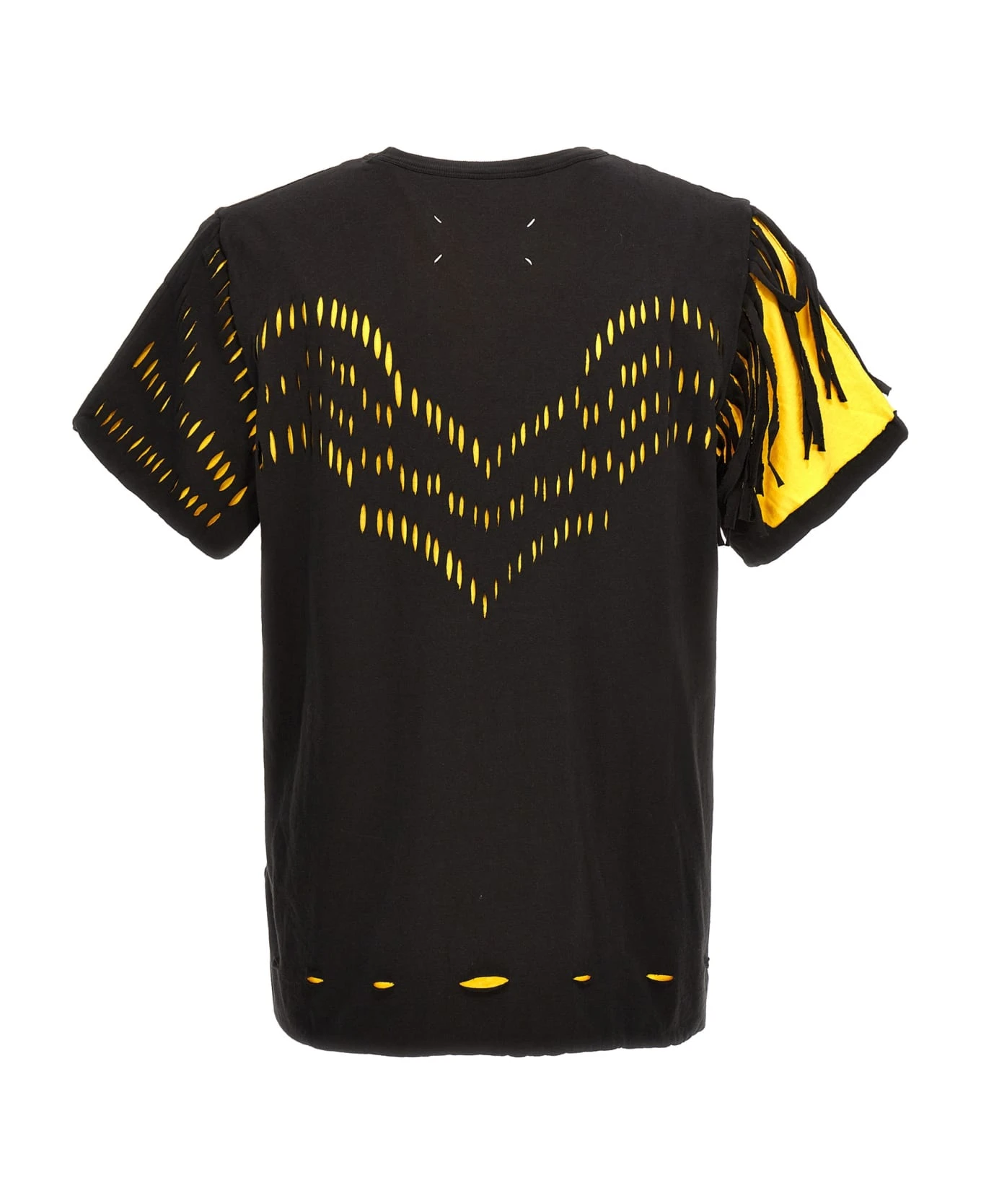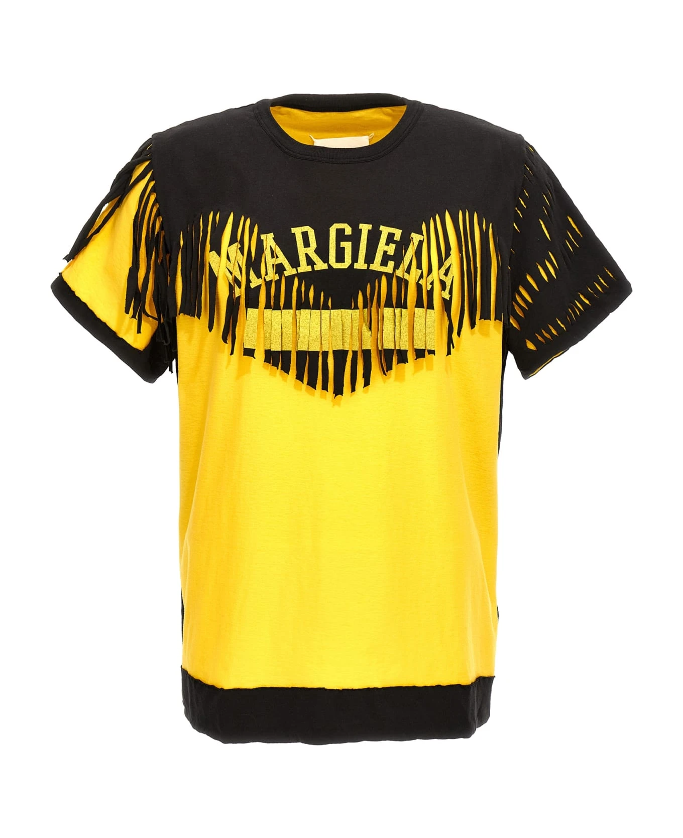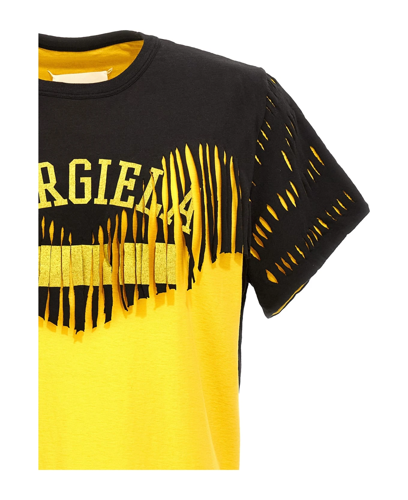 Cotton T-shirt with double layer effect torn with fringes, crewneck model with logo print.
