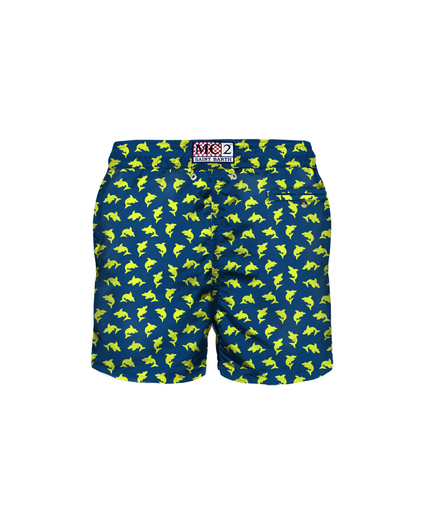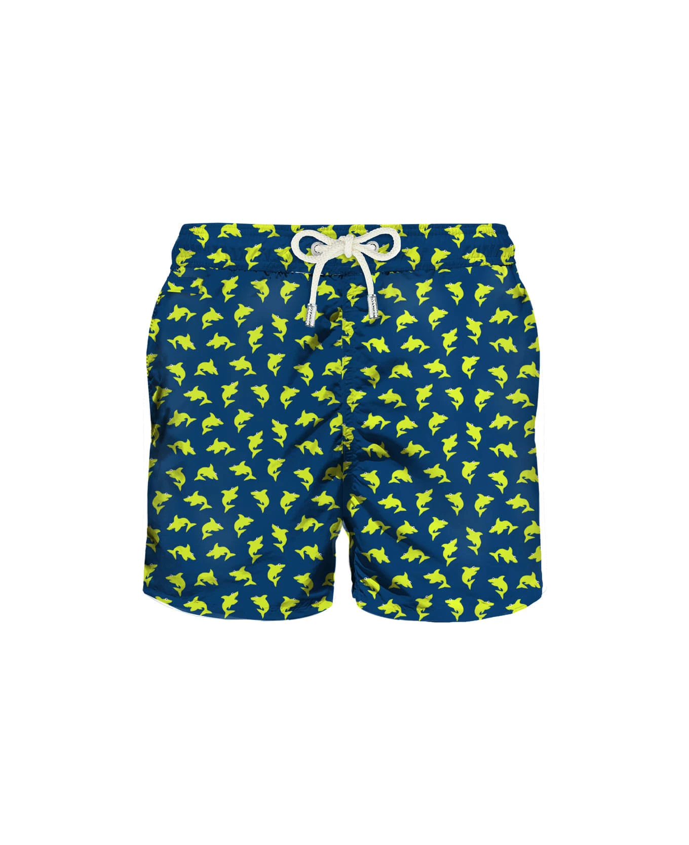 Man’s classic swim short,blue mini yellow shark print, light fabric, quick drying, mid-lenght, light net lining, elasticated waistband, drawstring fastening, front and back pocket with button.