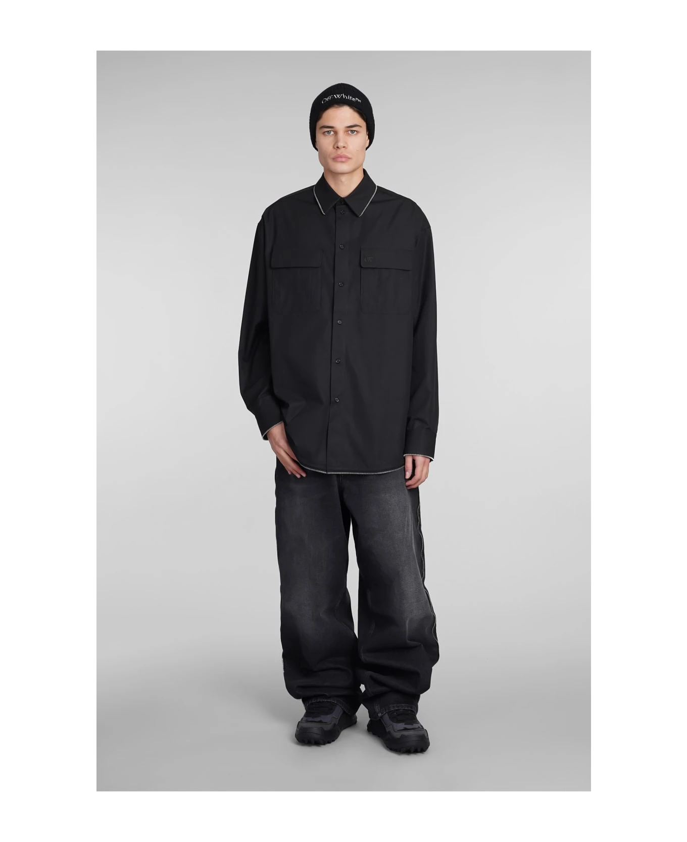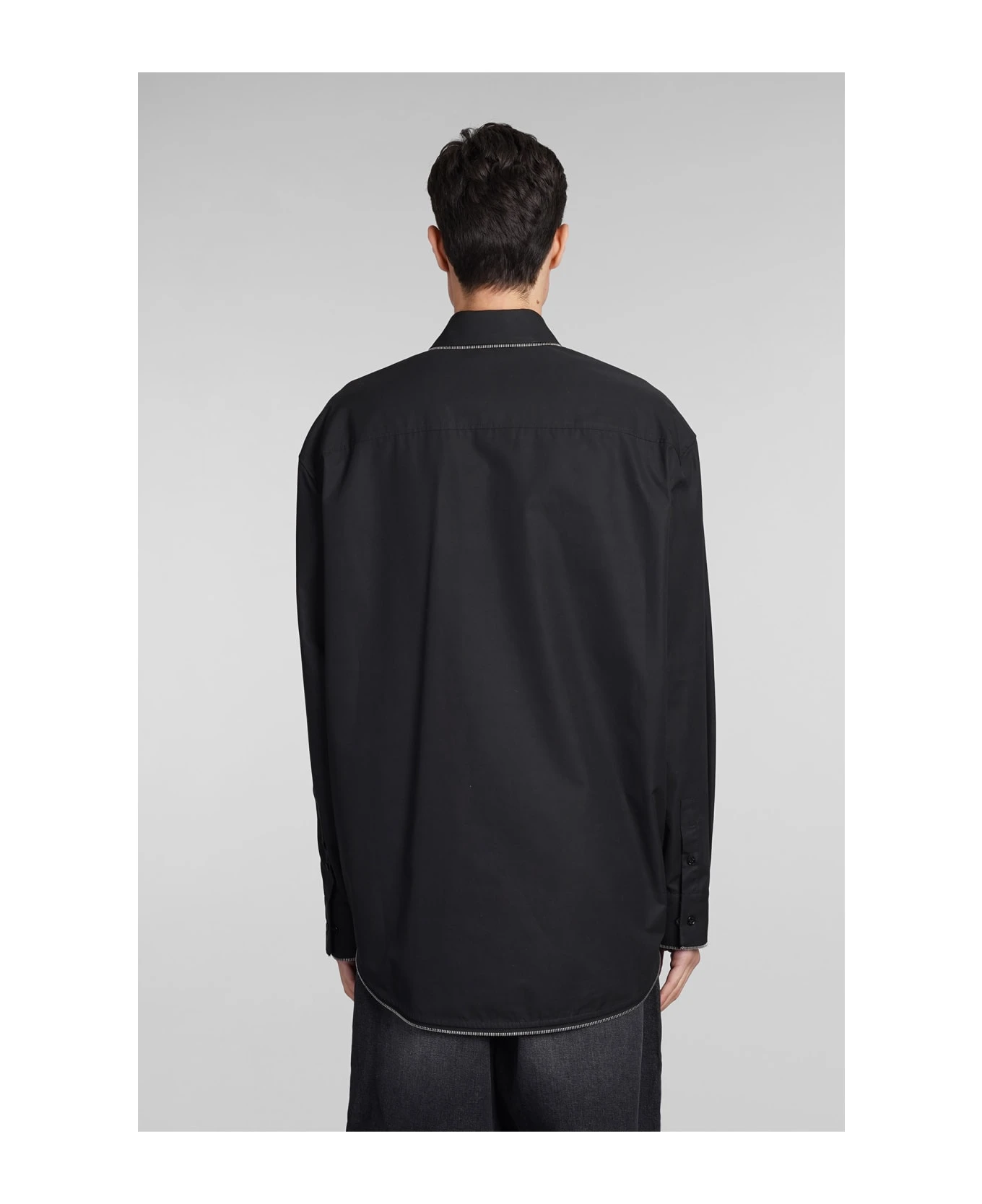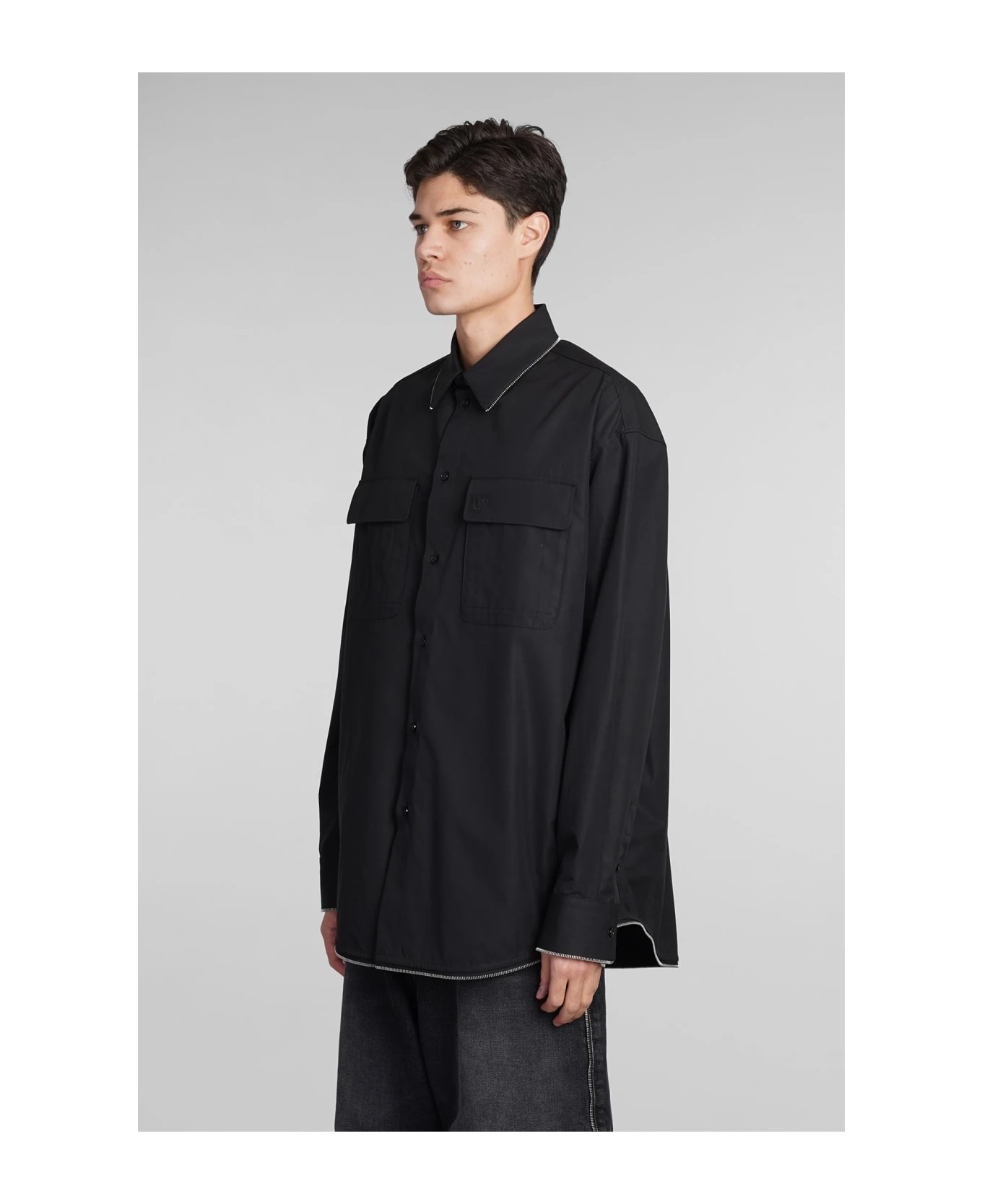 Shirt in black cotton, collar, flap pockets, long sleeves, frontal buttoning, zip detail, 100% cotton, Made in Italy, Model is 1. 83 and wears size M