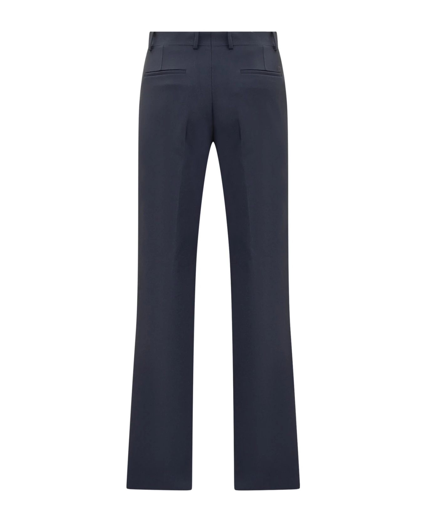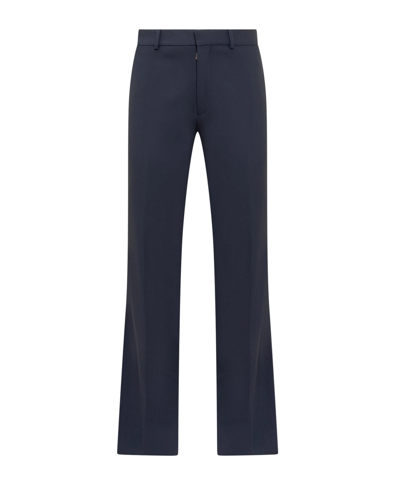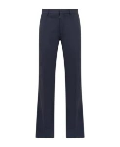 Blue long trousers. Button, hook and zip closure. Belt loops. Side and back pockets.