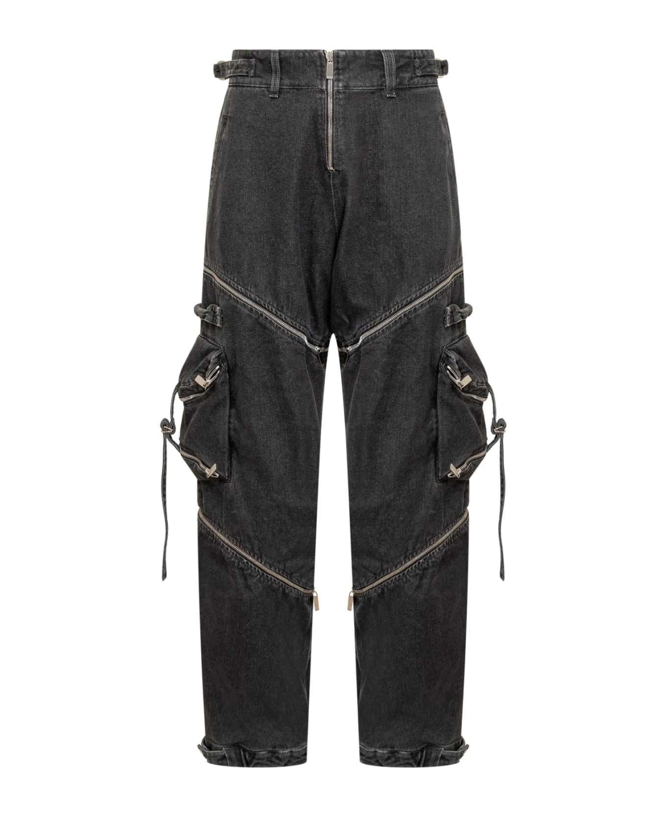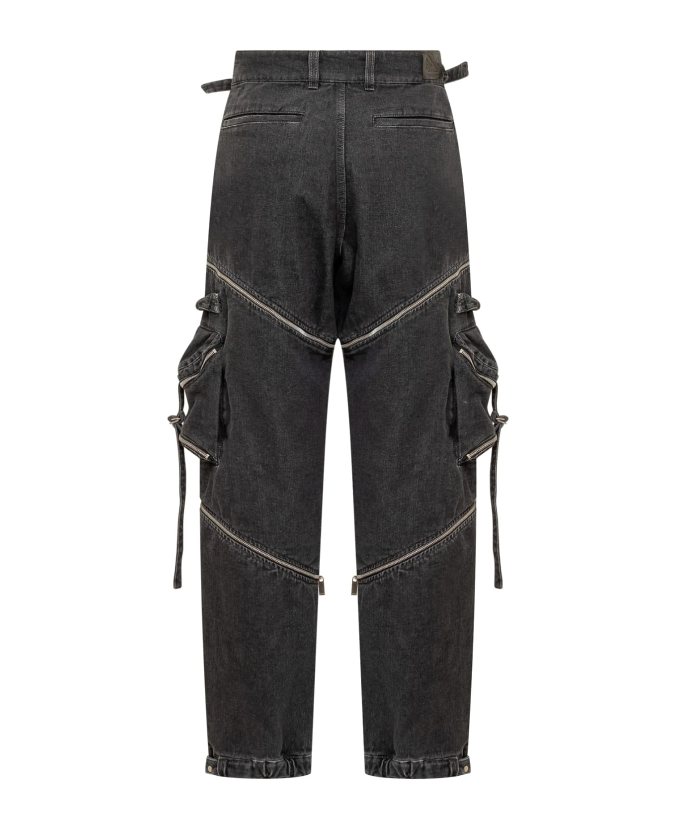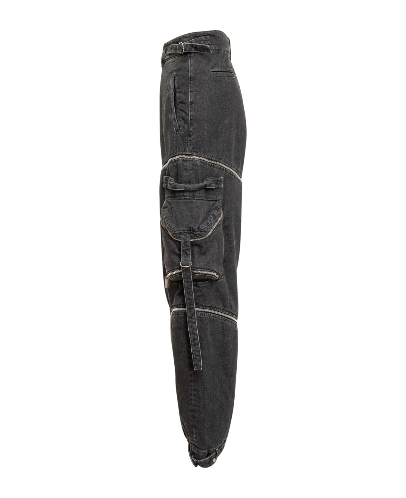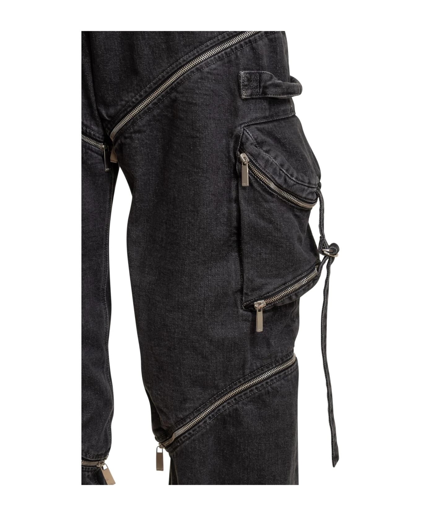 Black denim pants. Zipper closure. Belt loops. All-over zippers. Multiple pockets. Straps on pockets.