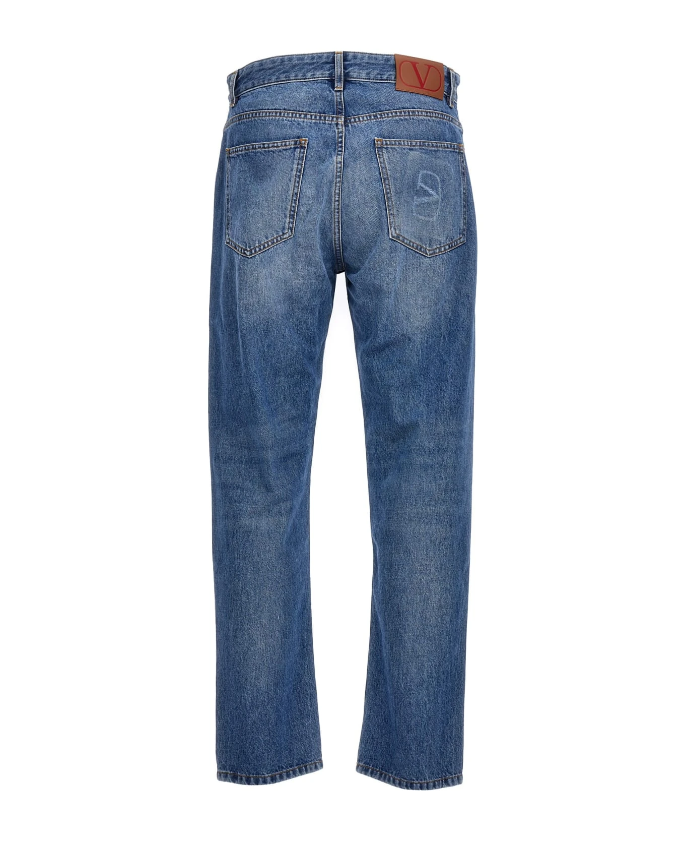 Straight fit denim jeans with zip and button closure, medium blue wash and a small rip detail.