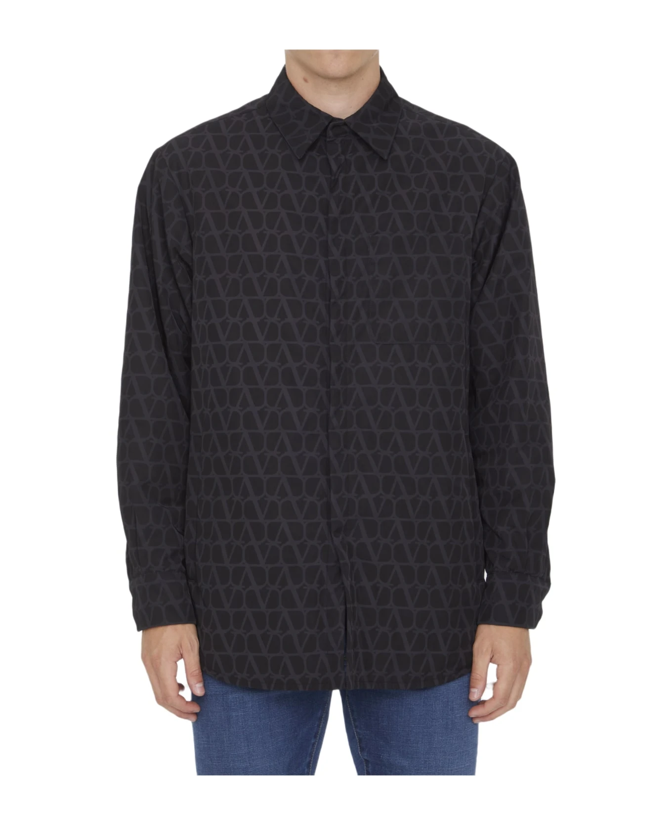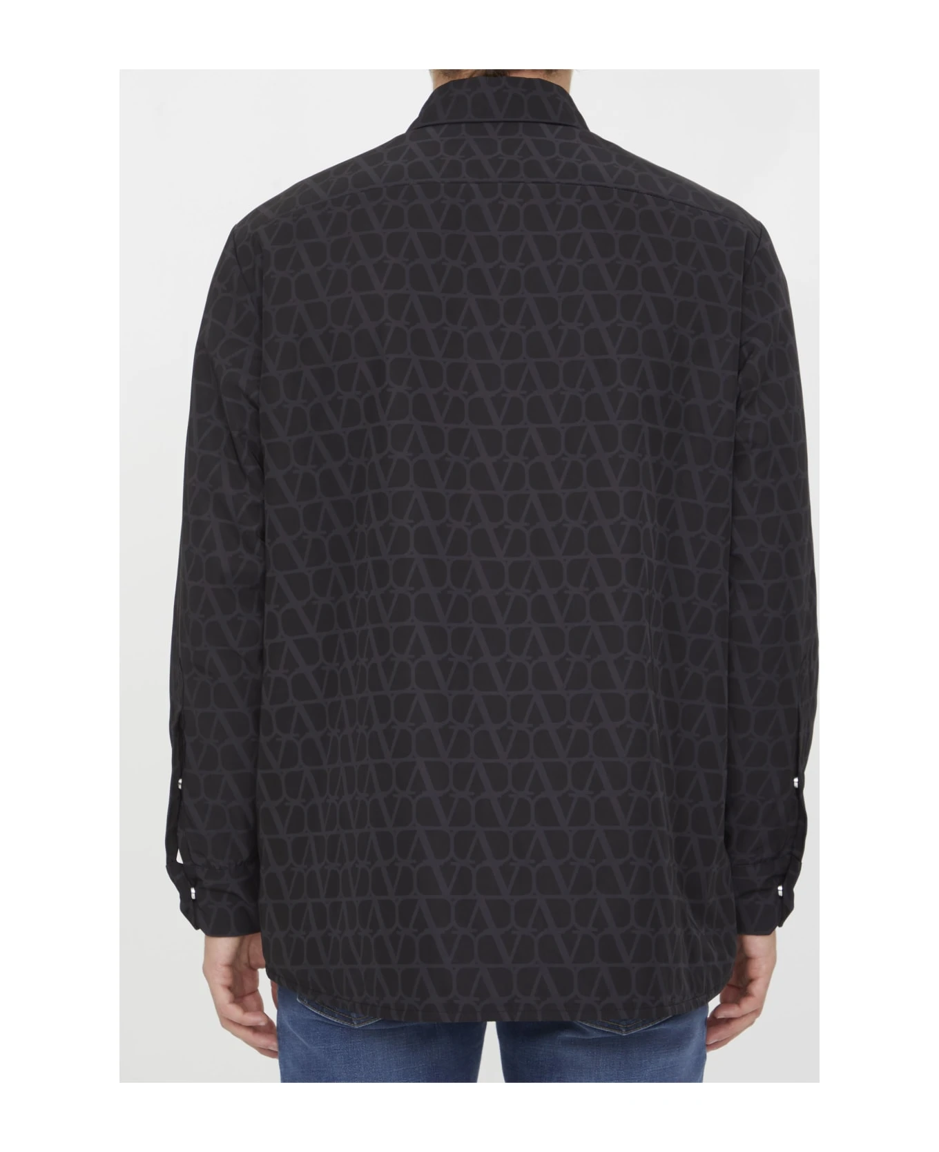 Black nylon shirt with all-over VLogo. It features classic collar, front button closure, two side pockets and press-stud cuffs. Regular fit.