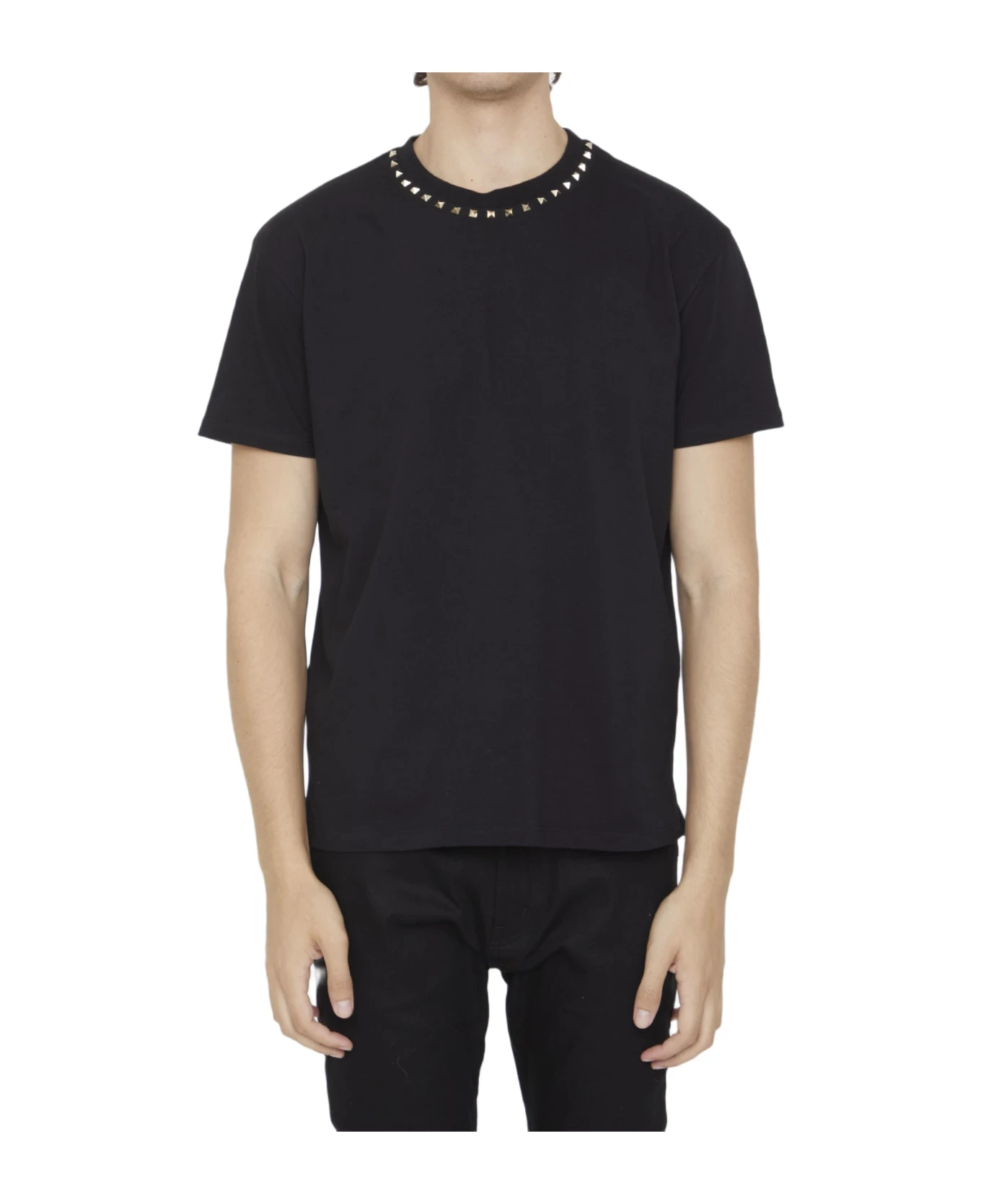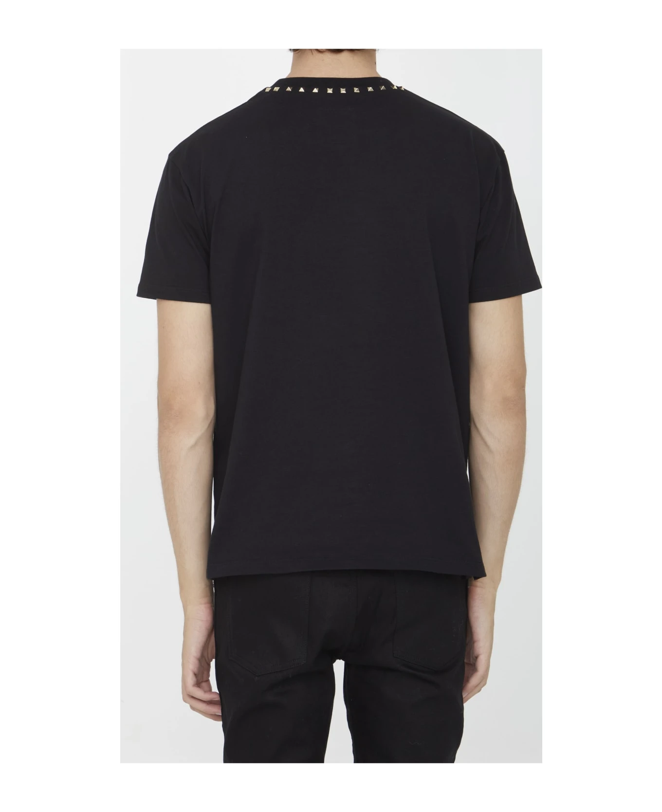 Short-sleeved crewneck t-shirt in black cotton with platinum-finish studs on neckline. Ribbed neck. Regular fit.