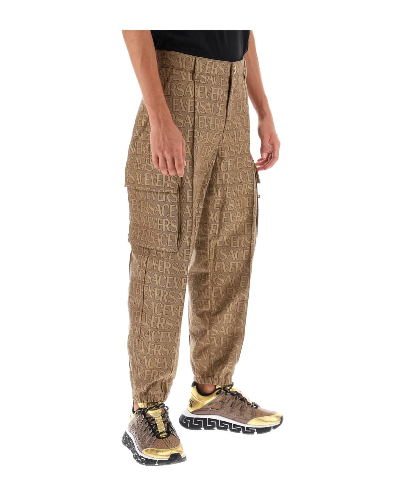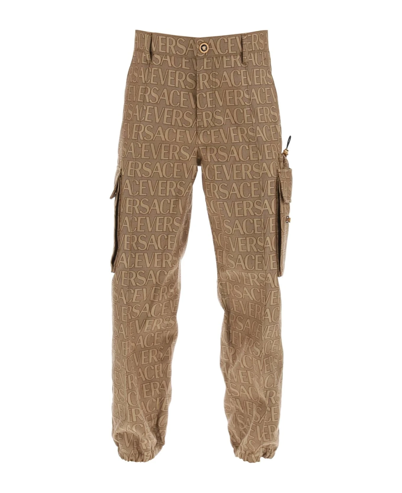 Cargo pants made of jacquard canvas, characterized by Versace Allover pattern and embellished with enameled Medusa buttons. Button and concealed zipper closure, elasticized waist and ankles, slanted side pockets, back welt pockets, cargo pockets. Regular fit. The model is 187 cm tall and wears a size IT 46.