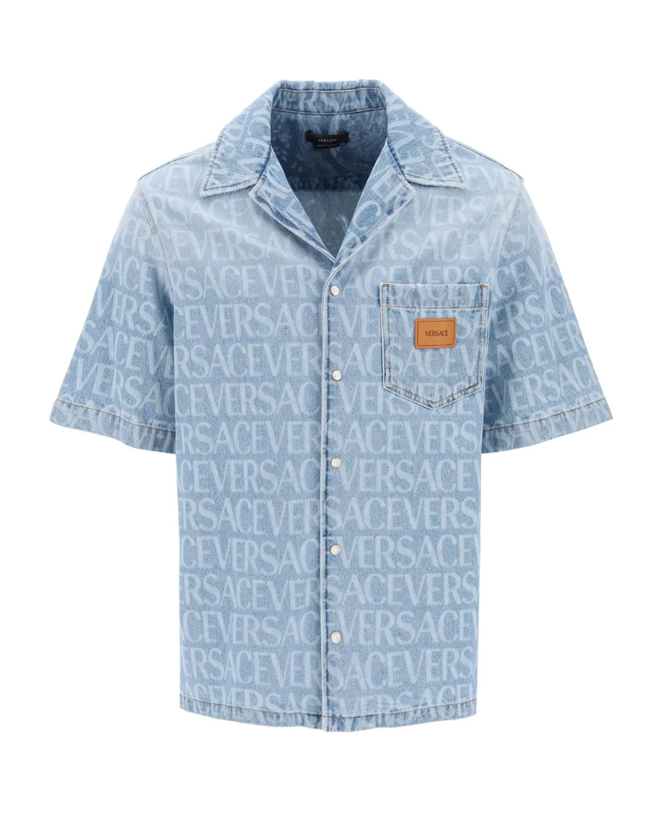 Cut from stonewashed denim to a relaxed fit, this short-sleeved shirt boasts a lasered Versace Allover pattern on the front and sleeves, and a Barocco Silhouette motif on the back. Detailed with mother-of-pearl Medusa snap buttons, this style is finished with an open collar and a chest pocket sporting a leather logo label. The model is 187 cm tall and wears a size IT 48.