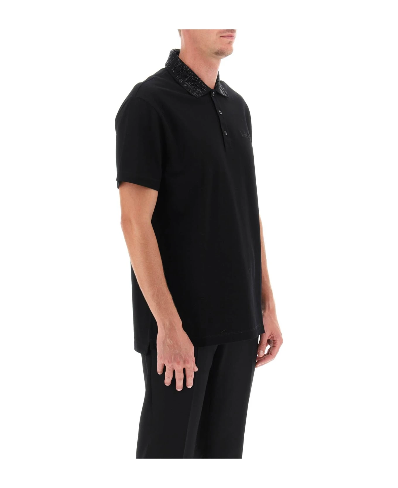 Polo shirt by Versace crafted in pure cotton pique, characterized by spread collar embellished with Barocco Silhouette motif in tonal crystals. It features partial button placket, chest logo embroidery and asymmetrical hem with side slits. Regular fit. The model is 187 cm tall and wears size L.