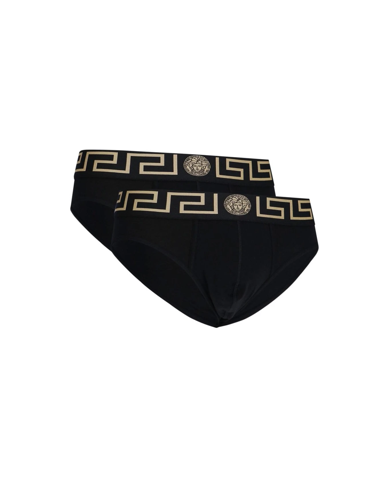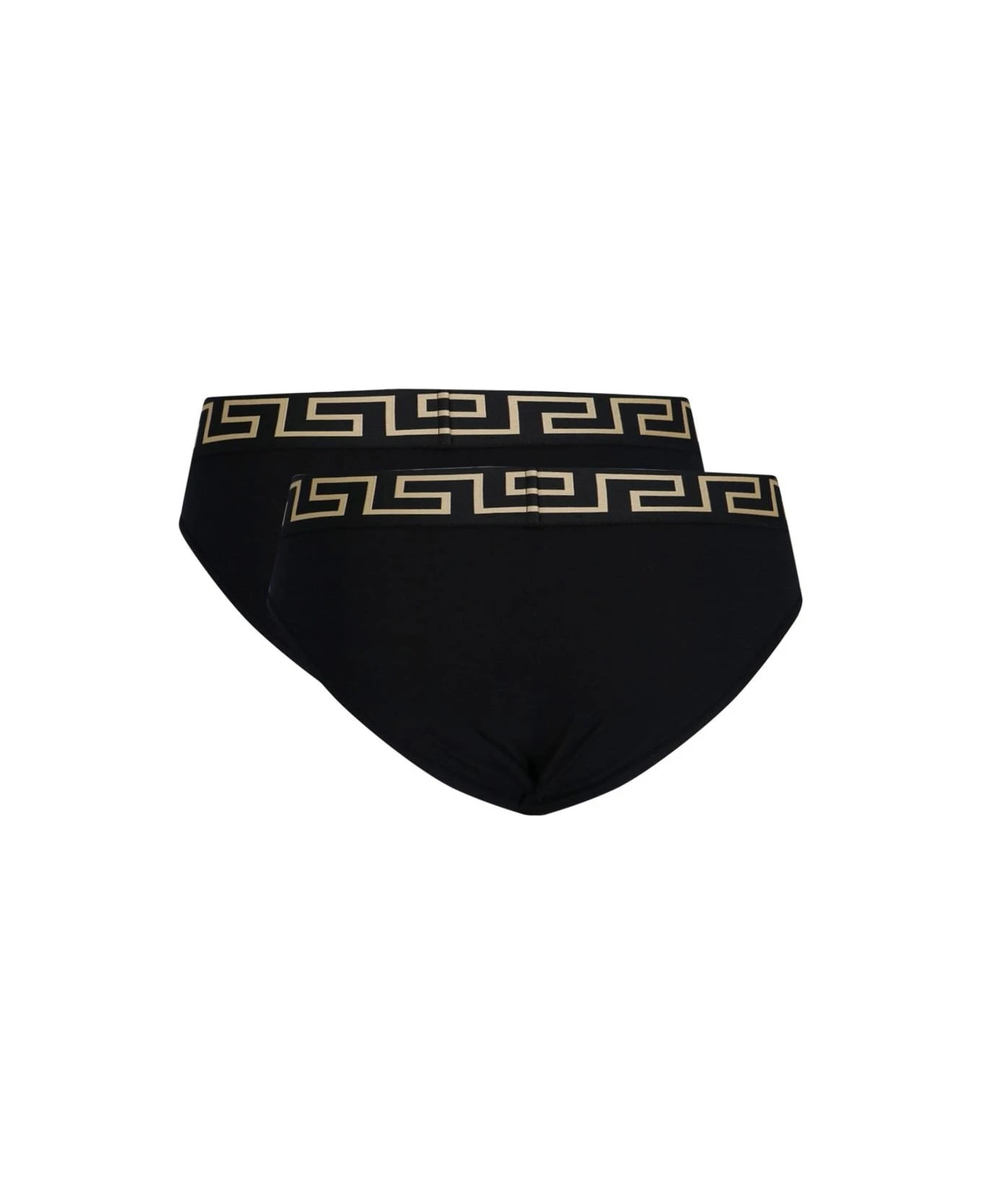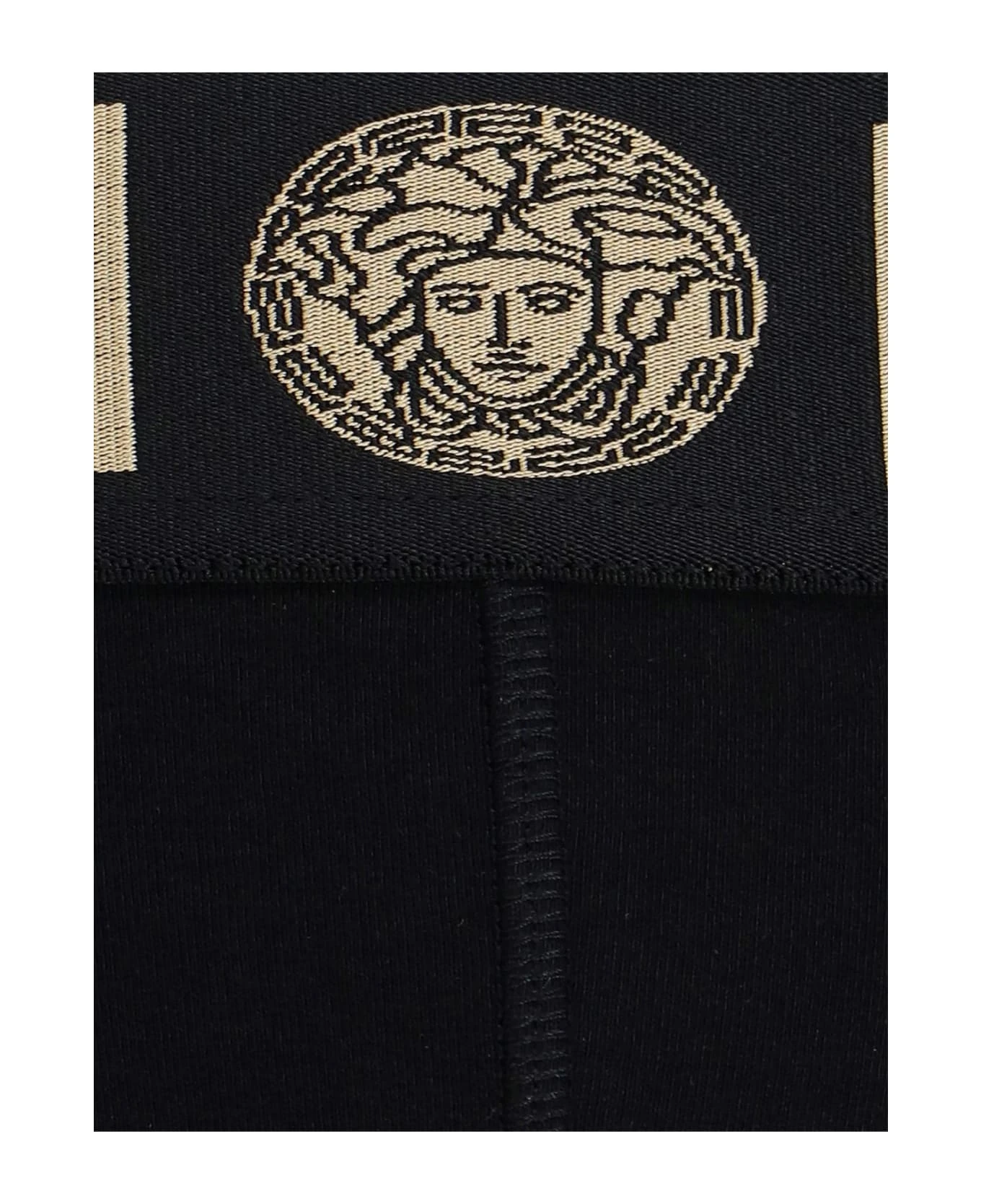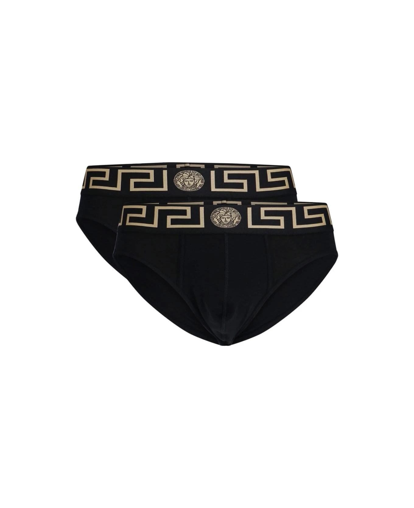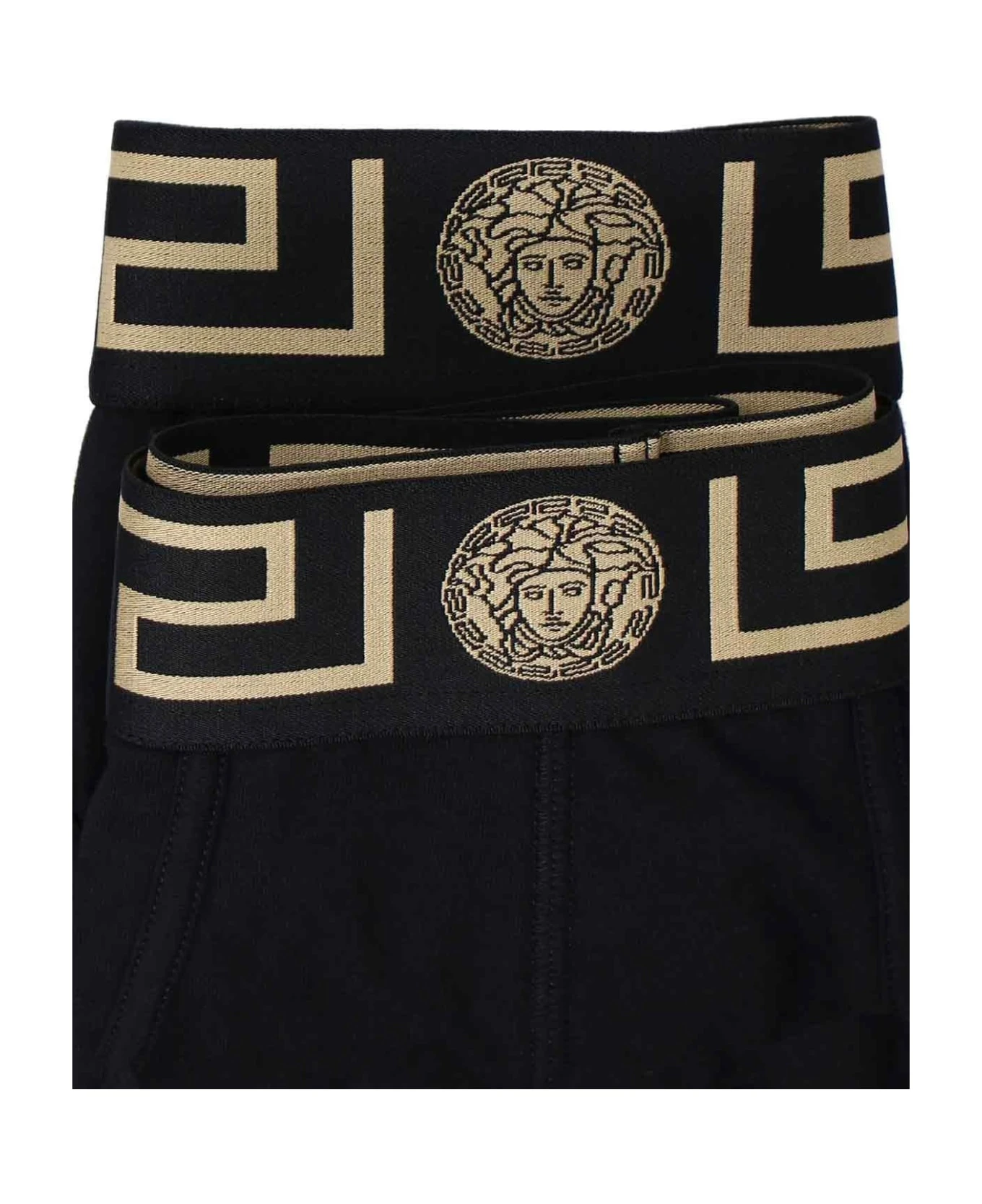 Versace ‘Bordo Greca’ briefs set – made in black organic cotton jersey with elastic waistband, greek pattern and a gold medusa.