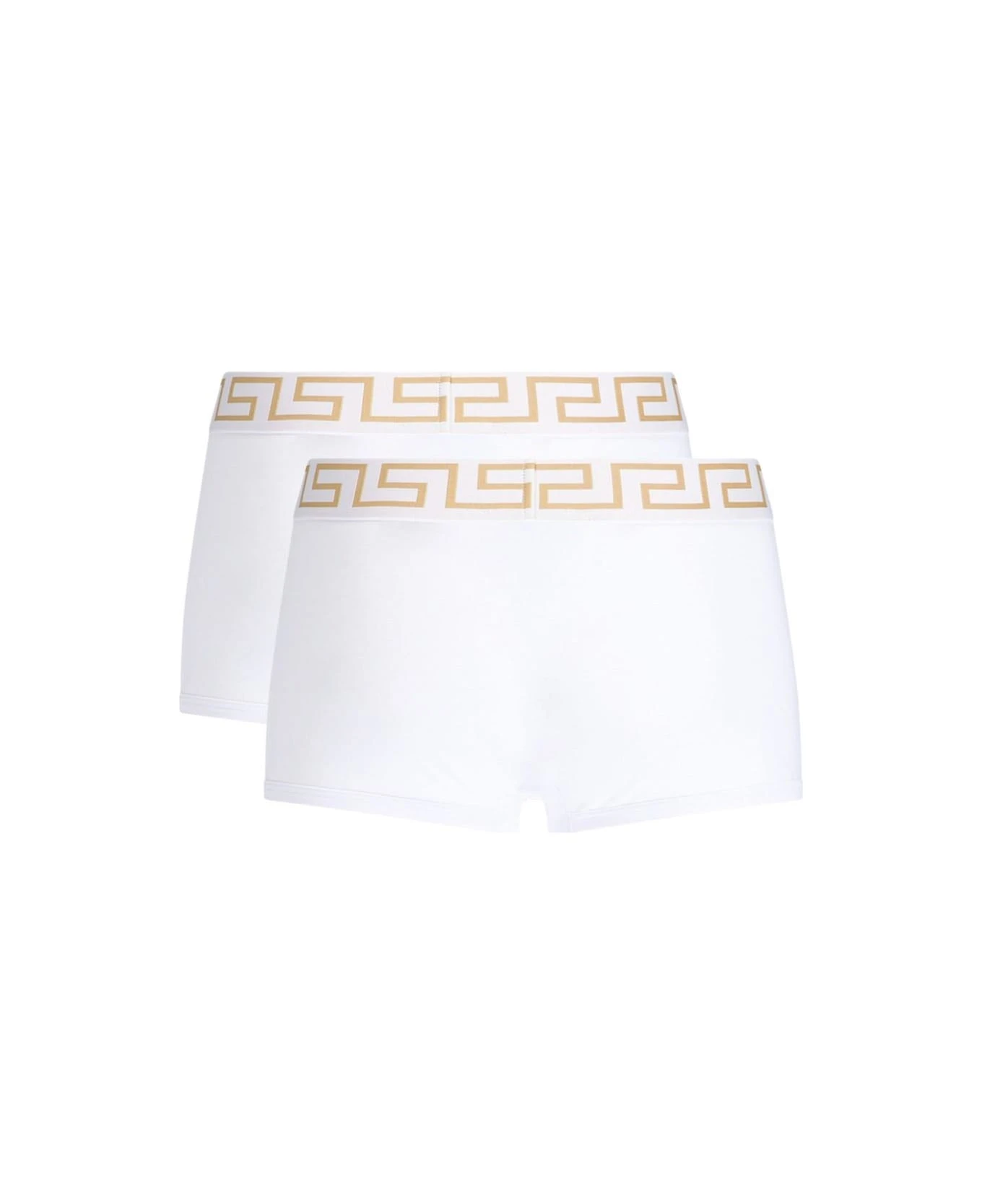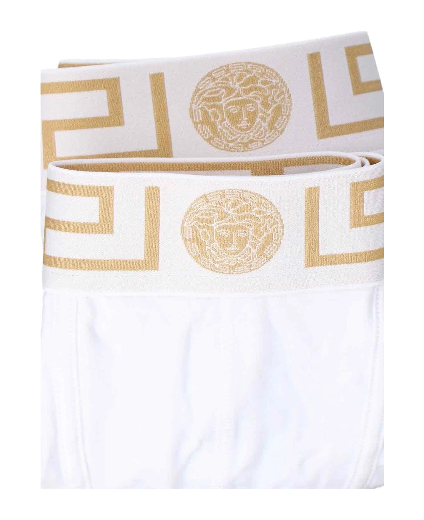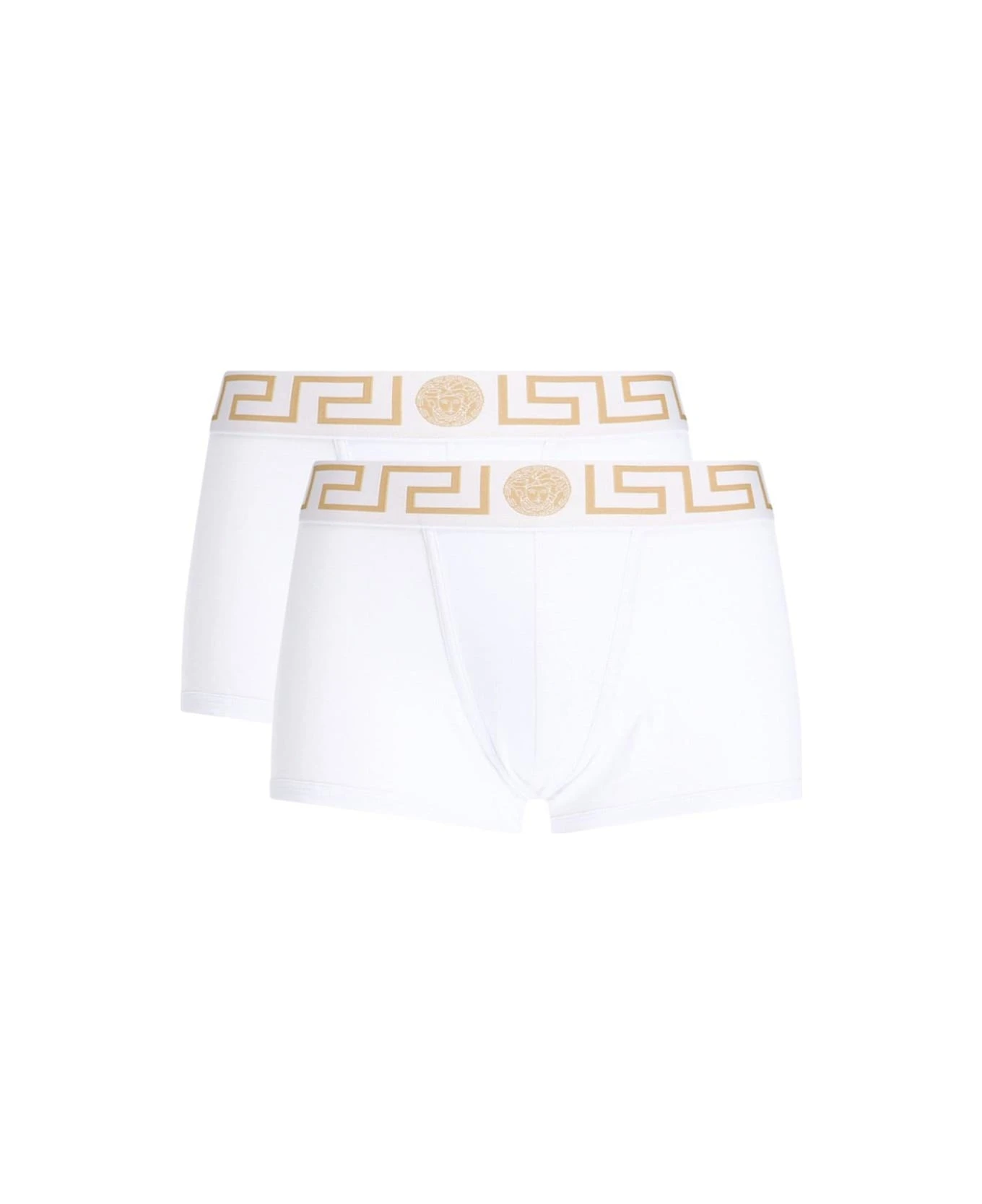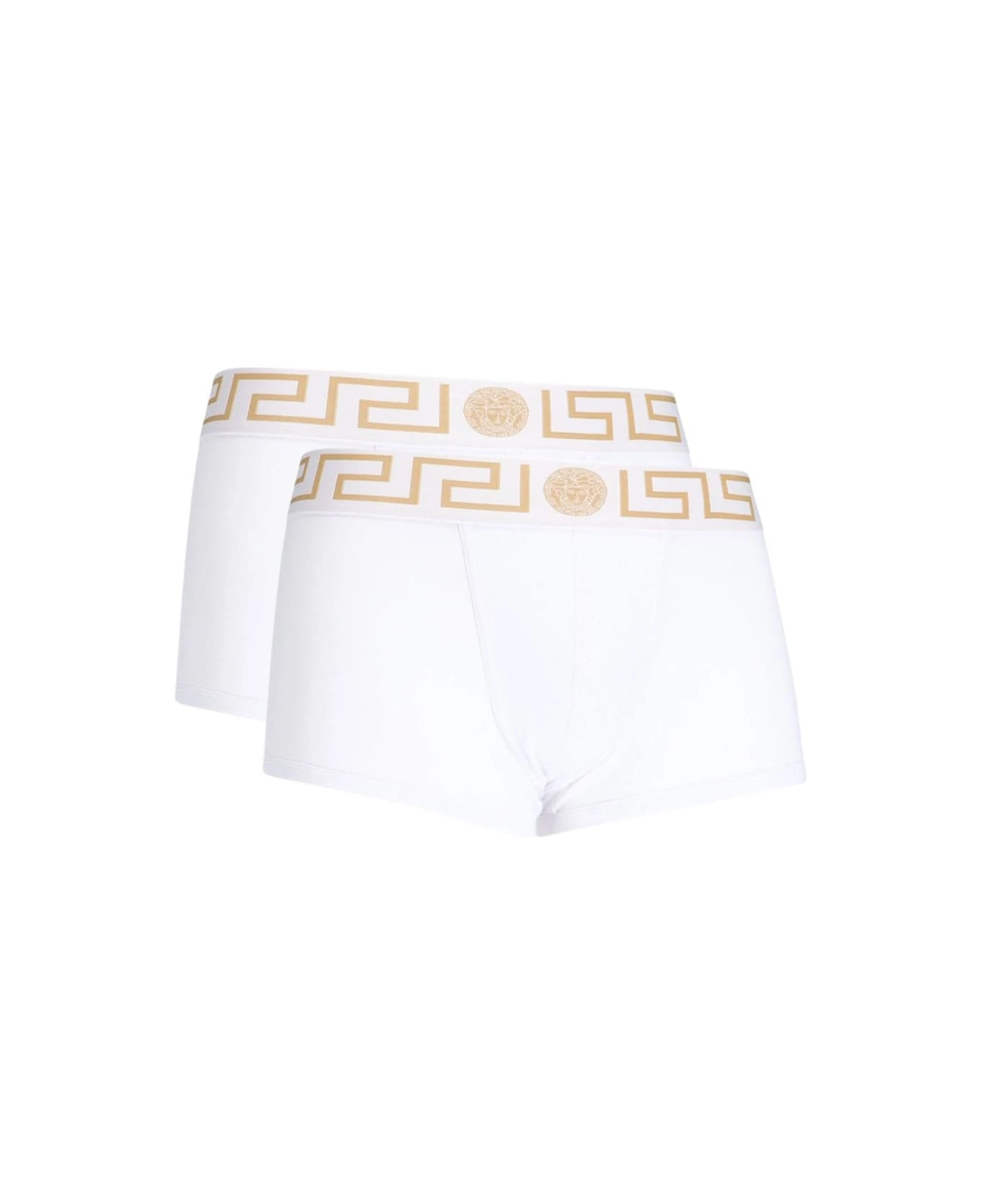 Versace ‘Bordo Greca’ boxer set – made in organic- white cotton jersey with elastic waistband, Greek pattern and a gold medusa.