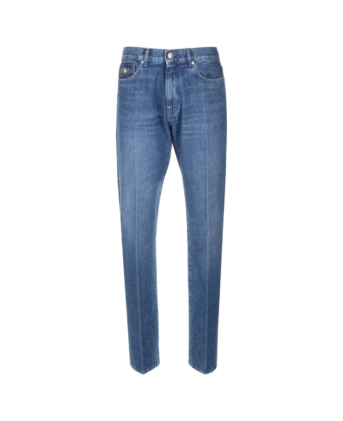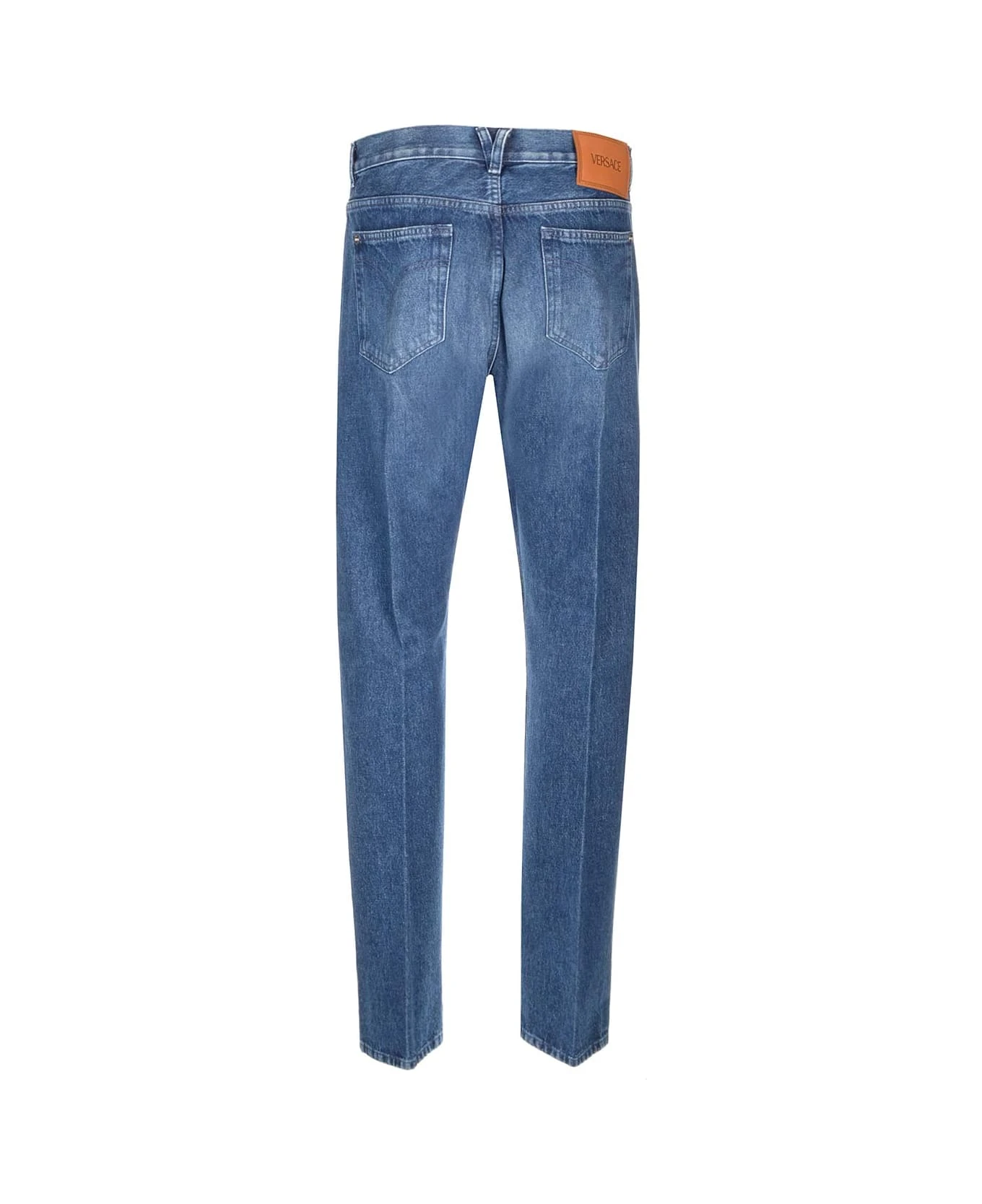 Straight leg jeans from Versace, in classic blue no-stretch denim with classic design, medium waist, hidden zip.