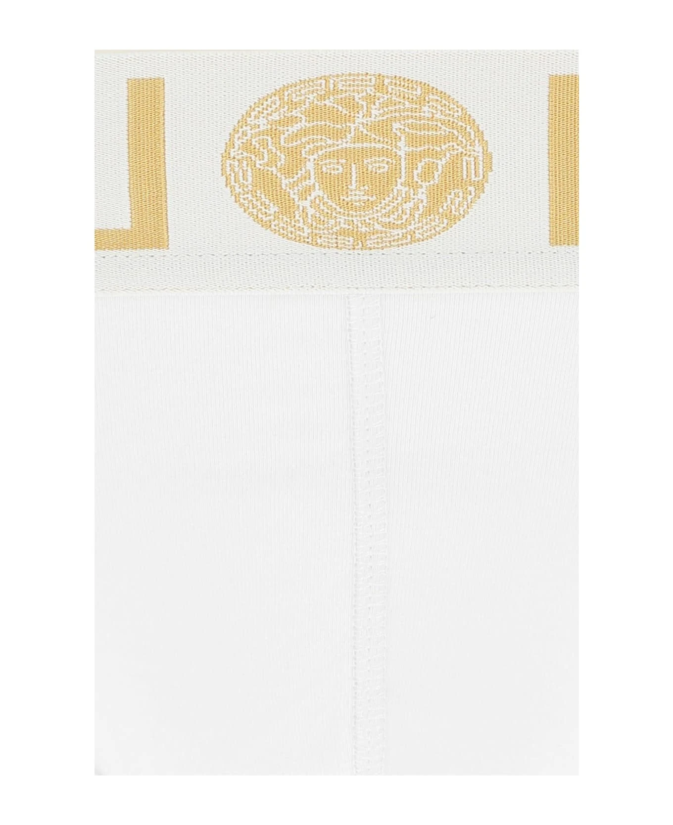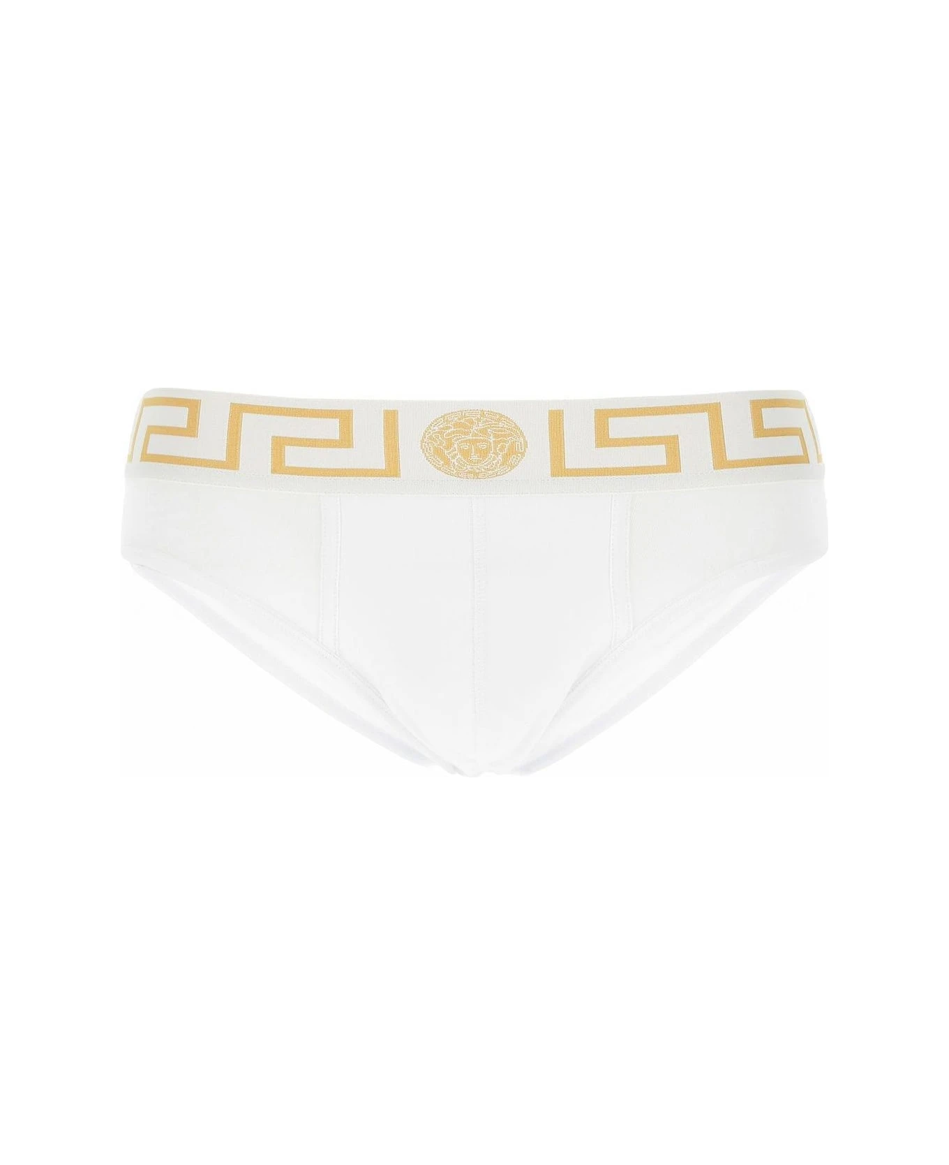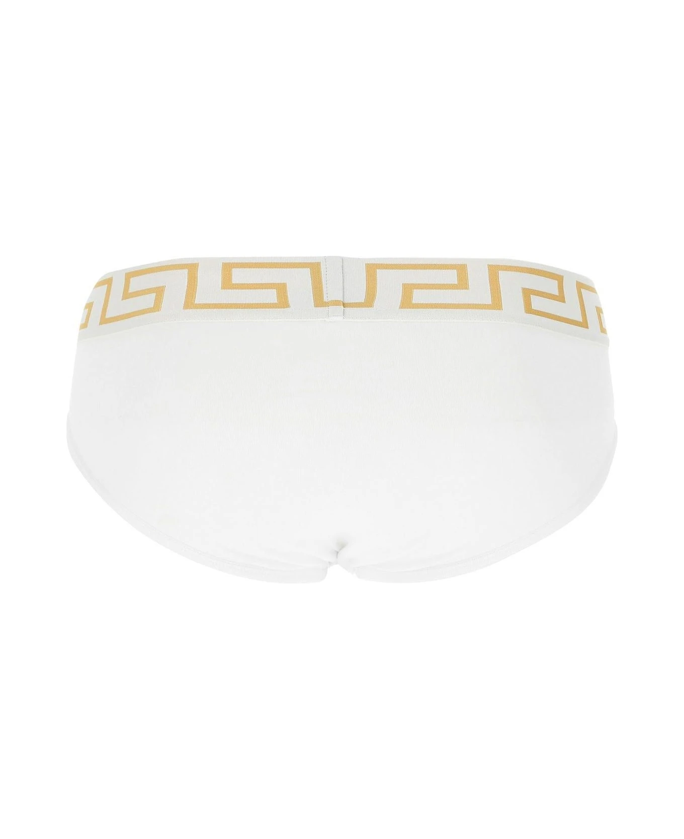 Two brief set realized stretch cotton characterized by Greek Key motif embroidered elastic waist.
