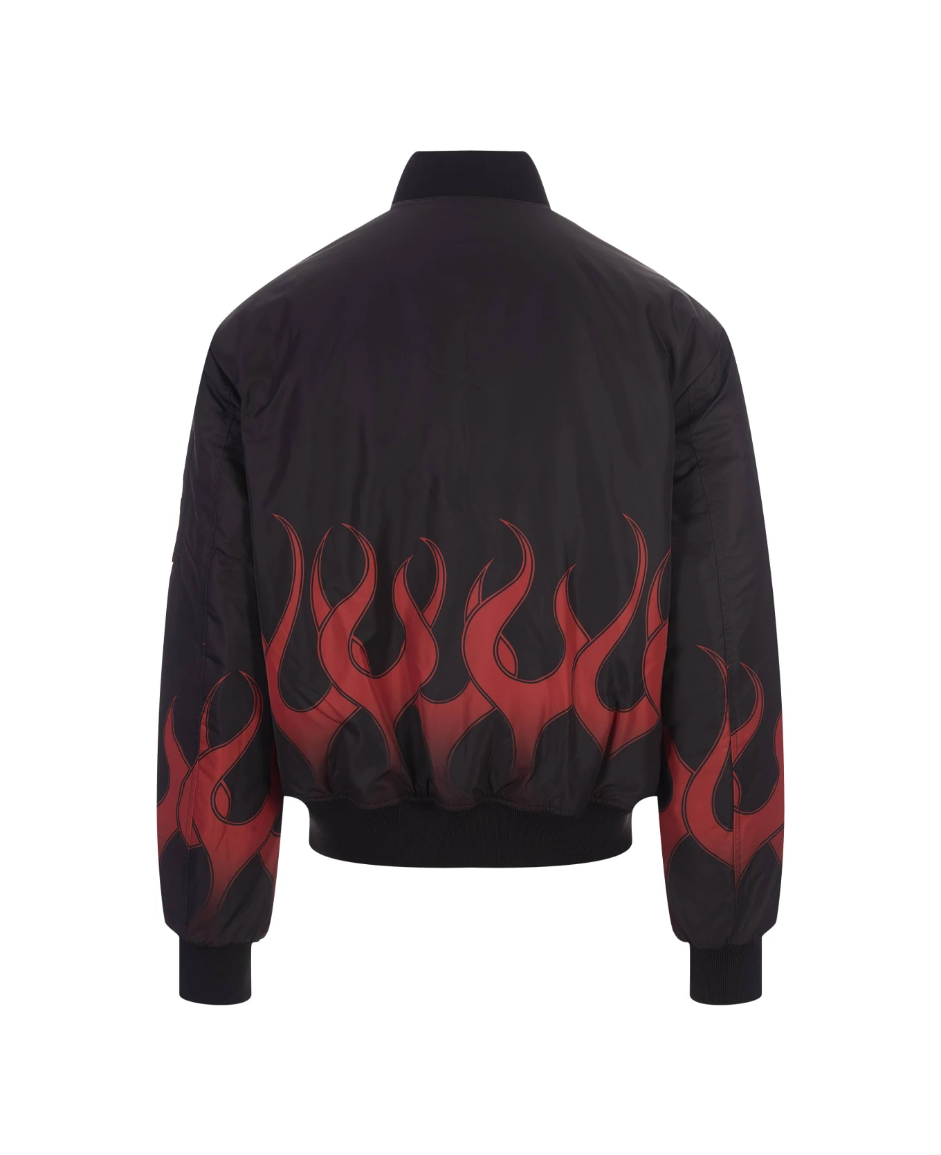 Vision Of Super padded bomber jacket in black nylon with digitally printed red flame graphics. It features ribbed knit trim, flap and button pockets, a contrasting logo on the chest, a pocket on the left sleeve and a practical front fastening with a two-way zip.